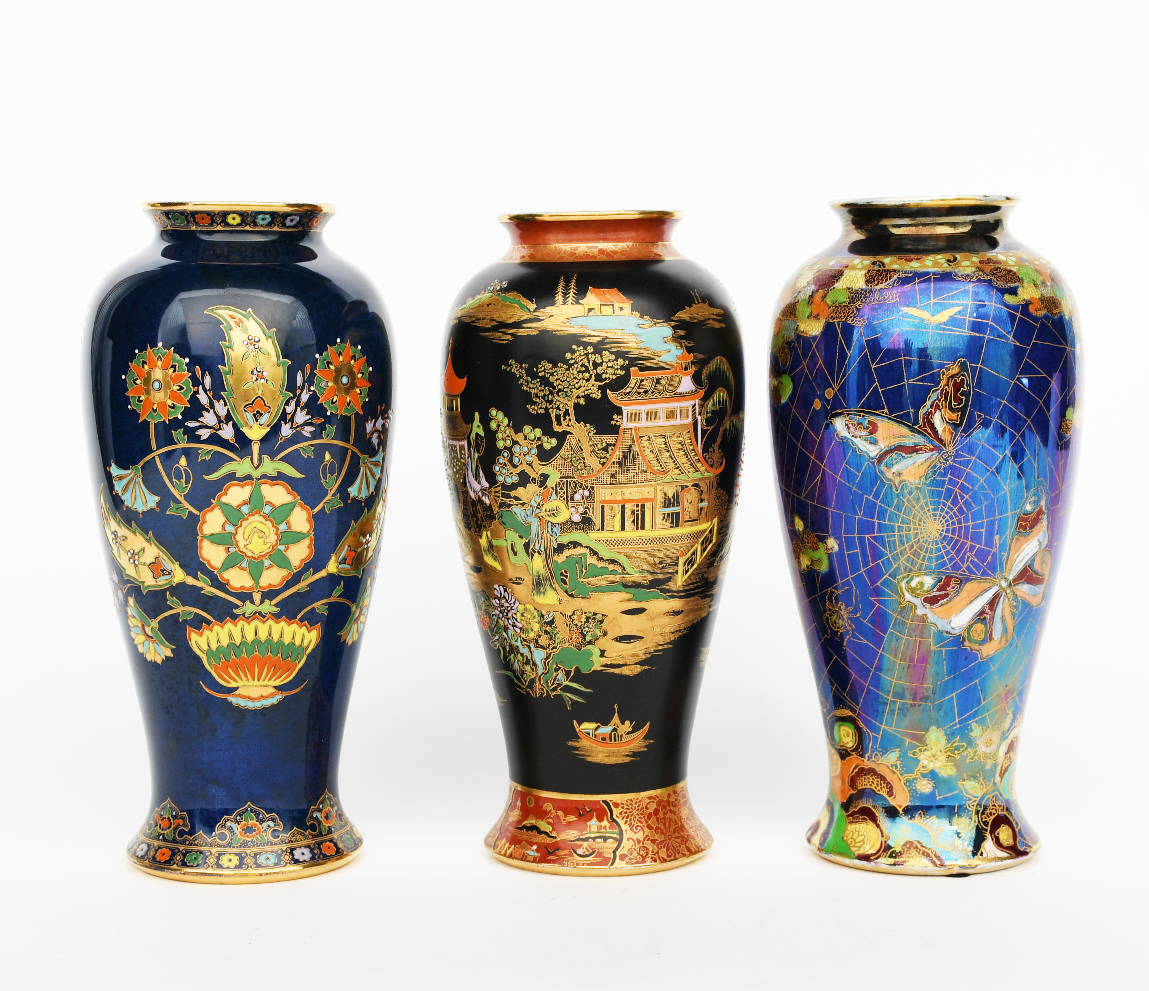 'New Flies' a Carlton Ware vase, pattern no. 3023, printed and painted with butterflies in colours on a blue lustre ground, another in the 'Mikado' pattern and another in a geometric floral 'pattern printed and painted factory marks, 26cm. high (3)