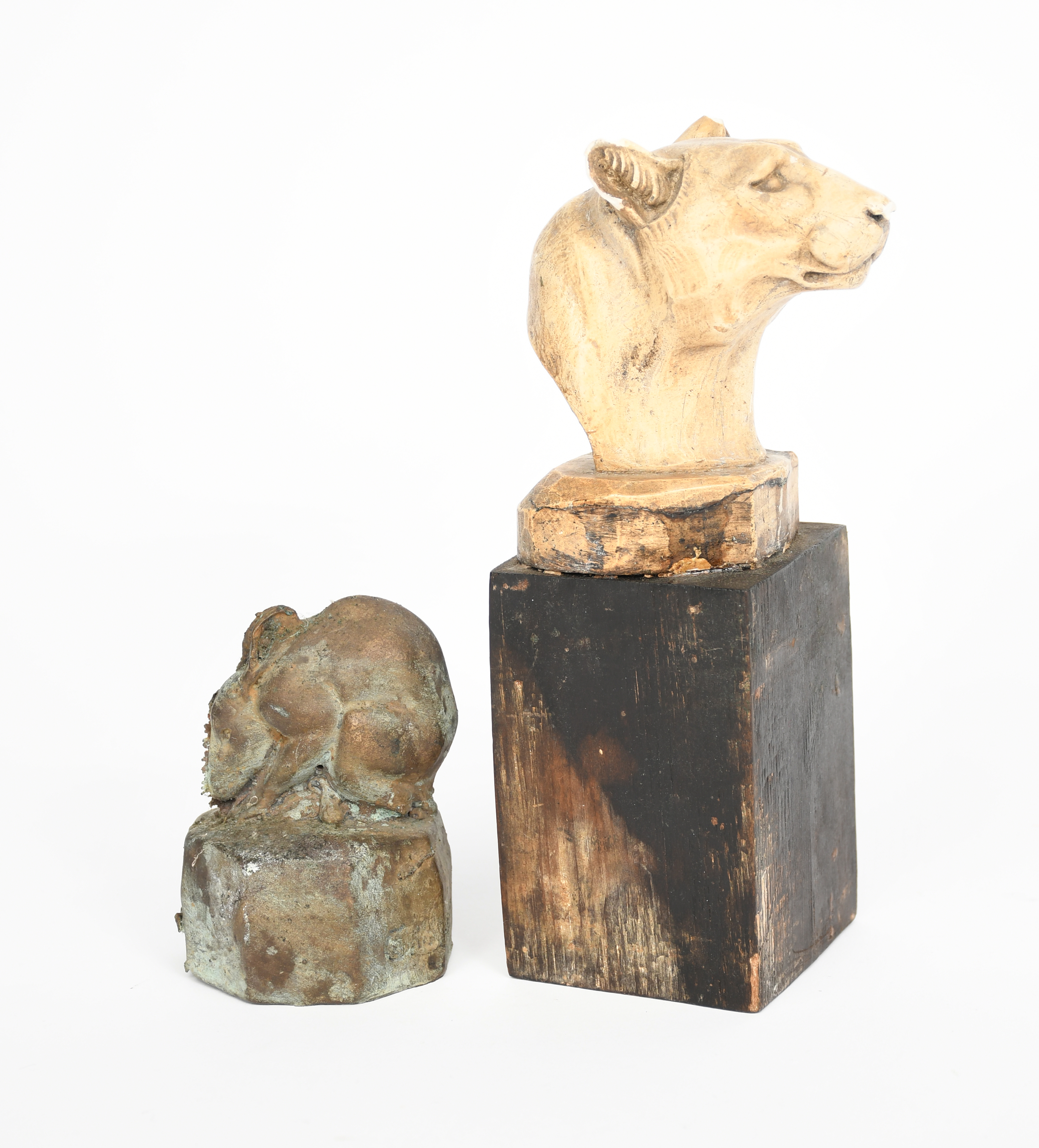 patinated plaster on ebonised wood plinth, and a bronze model by of a mouse by Donald Gilbert,