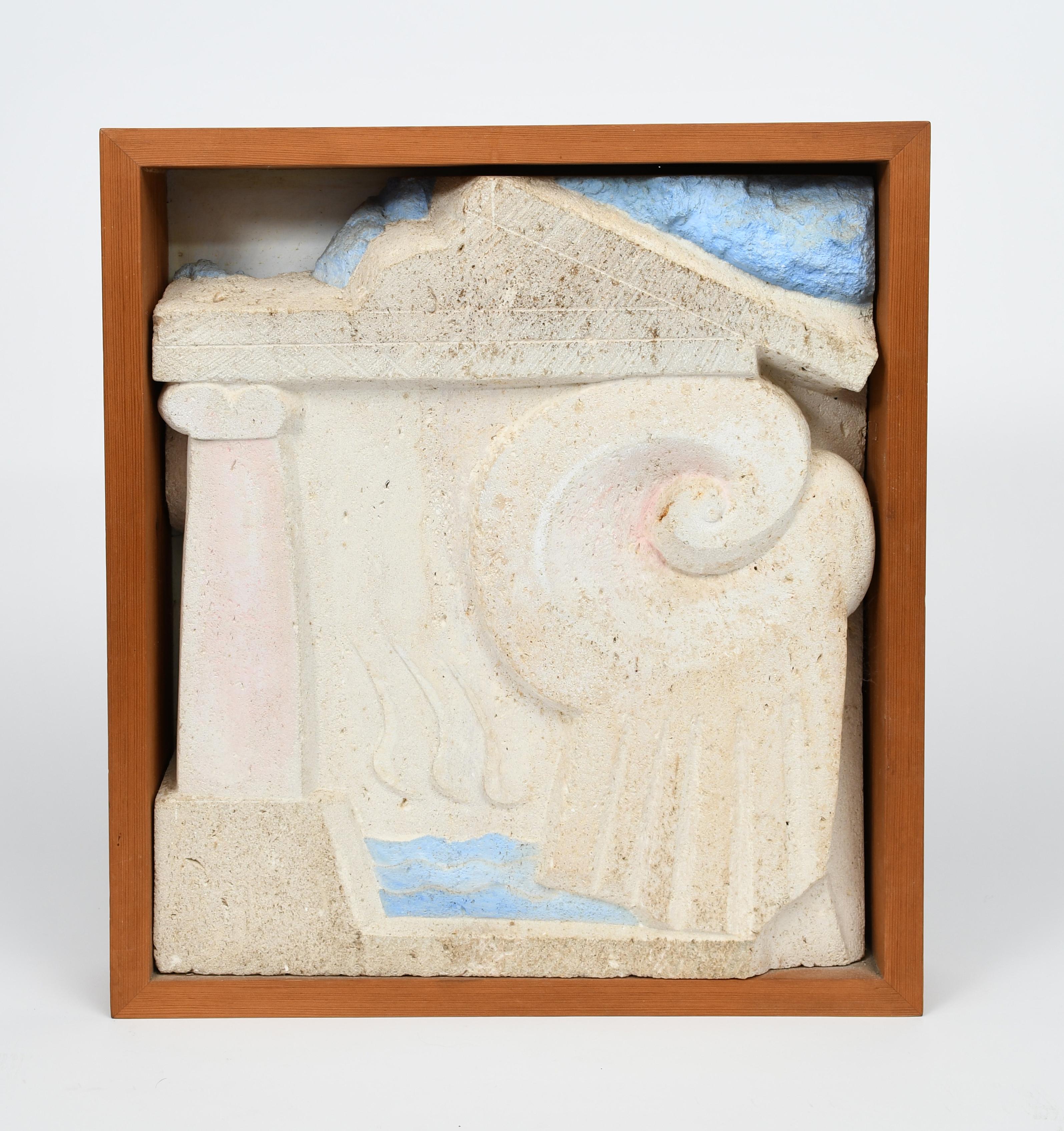Westwood Limestone with painted detail, framed in wood