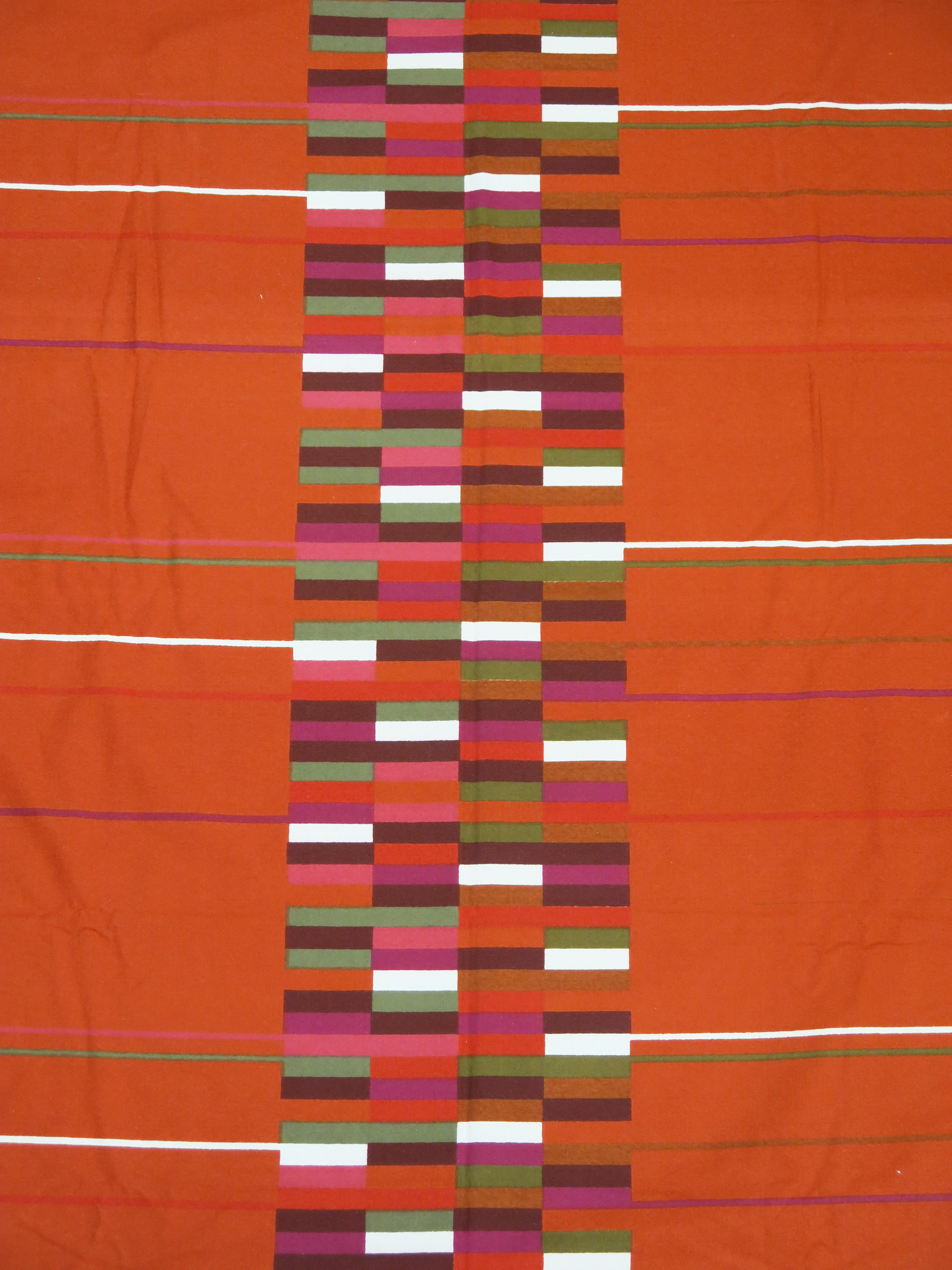 Causeway a screen printed cotton textile designed by Lucienne Day for Heal's, designed in 1967, printed with abstract column in purple, green and white flanked by blocks of coral red signed to selvedge, 420 x 126cm.