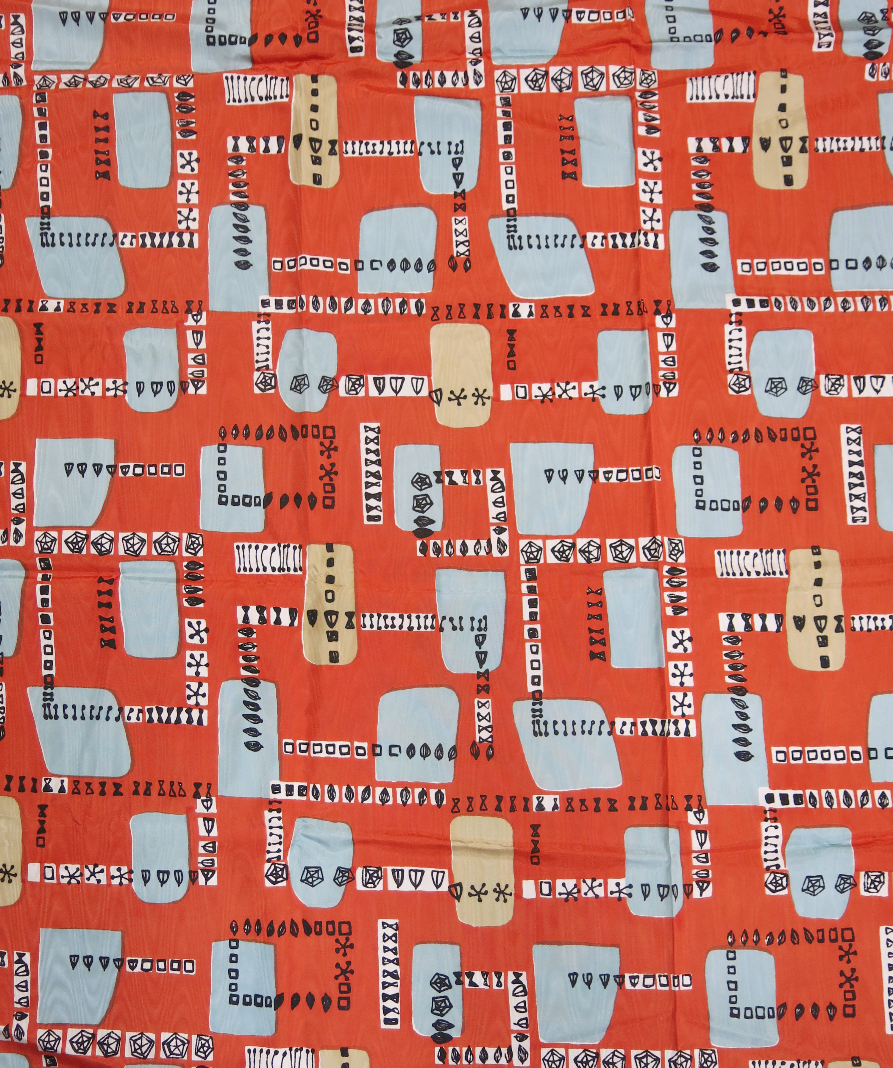 Quadrille a screen printed textile designed by Lucienne Day, designed in 1952, manufactured by British Celanese Ltd, printed in black, white, blue and mushroom on a red ground with geometric repeat, unsigned, 180 x 126cm