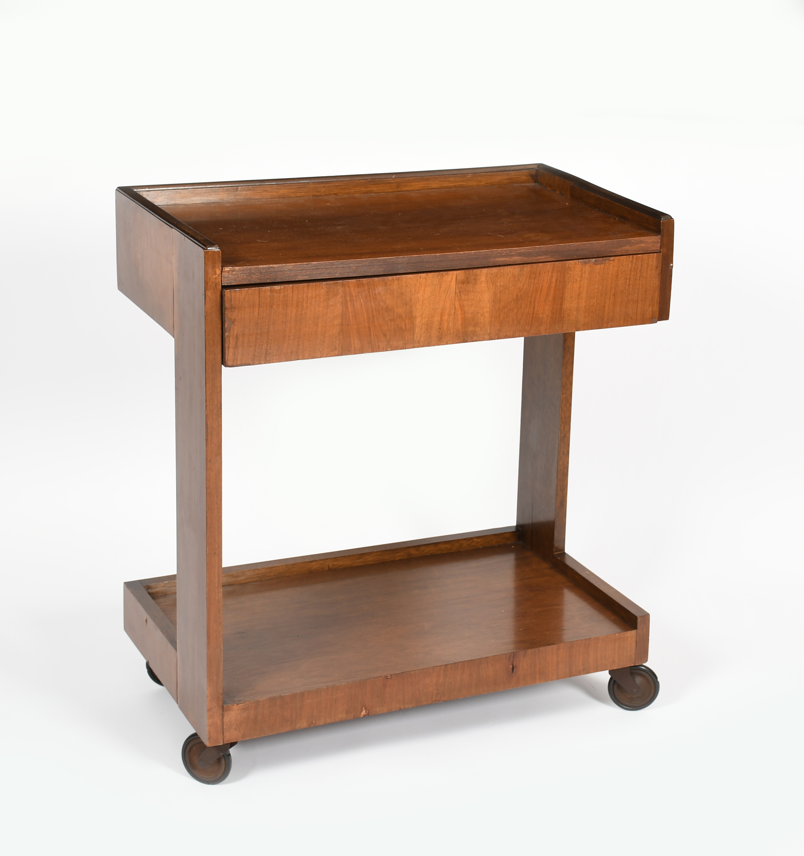 A mahogany serving trolley in the manner of Gerald Summers for Makers of Simple Furniture, rectangular top with rail and fitted cutlery drawer, over low rectangular shelf, on wheels, unsigned, 68 x 40.5cm (top), 78cm. high