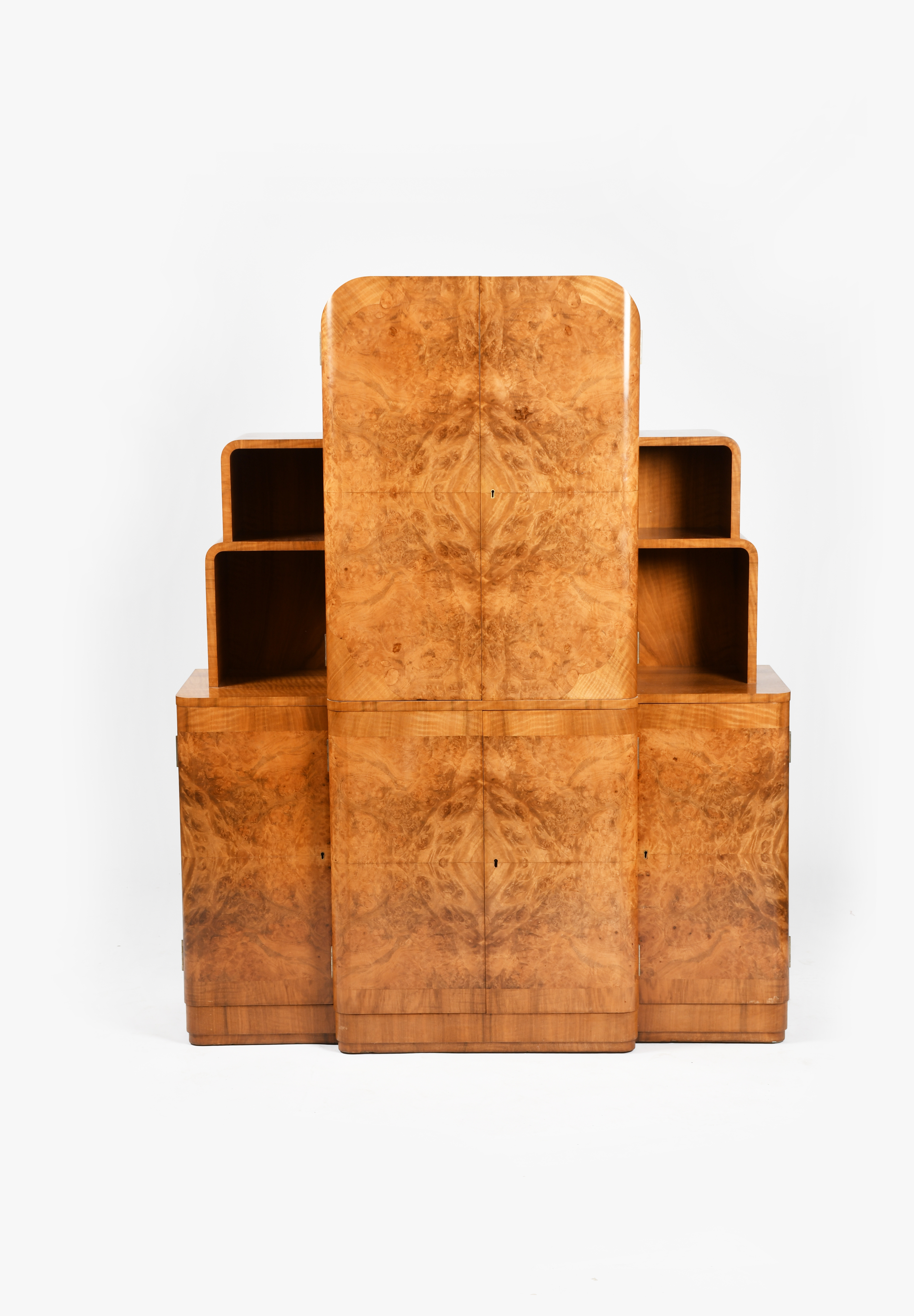 An Art Deco burr walnut veneer cocktail cabinet probably Epstein, L'Odeon form, two central twin door fitted cabinets, the top compartment with electric light, flanked with smaller side cabinets below stepped shelves, fitted with suite of glasses, decanters, cocktail shaker and tray, unsigned, one glass missing, 122cm wide, 153cm. high
