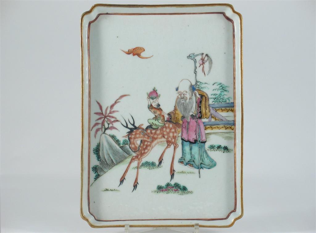 A Chinese famille rose rectangular tray, painted with Shoulao a small boy holding a peach beneath a bat while balancing on the back of a deer, 24.7cm.