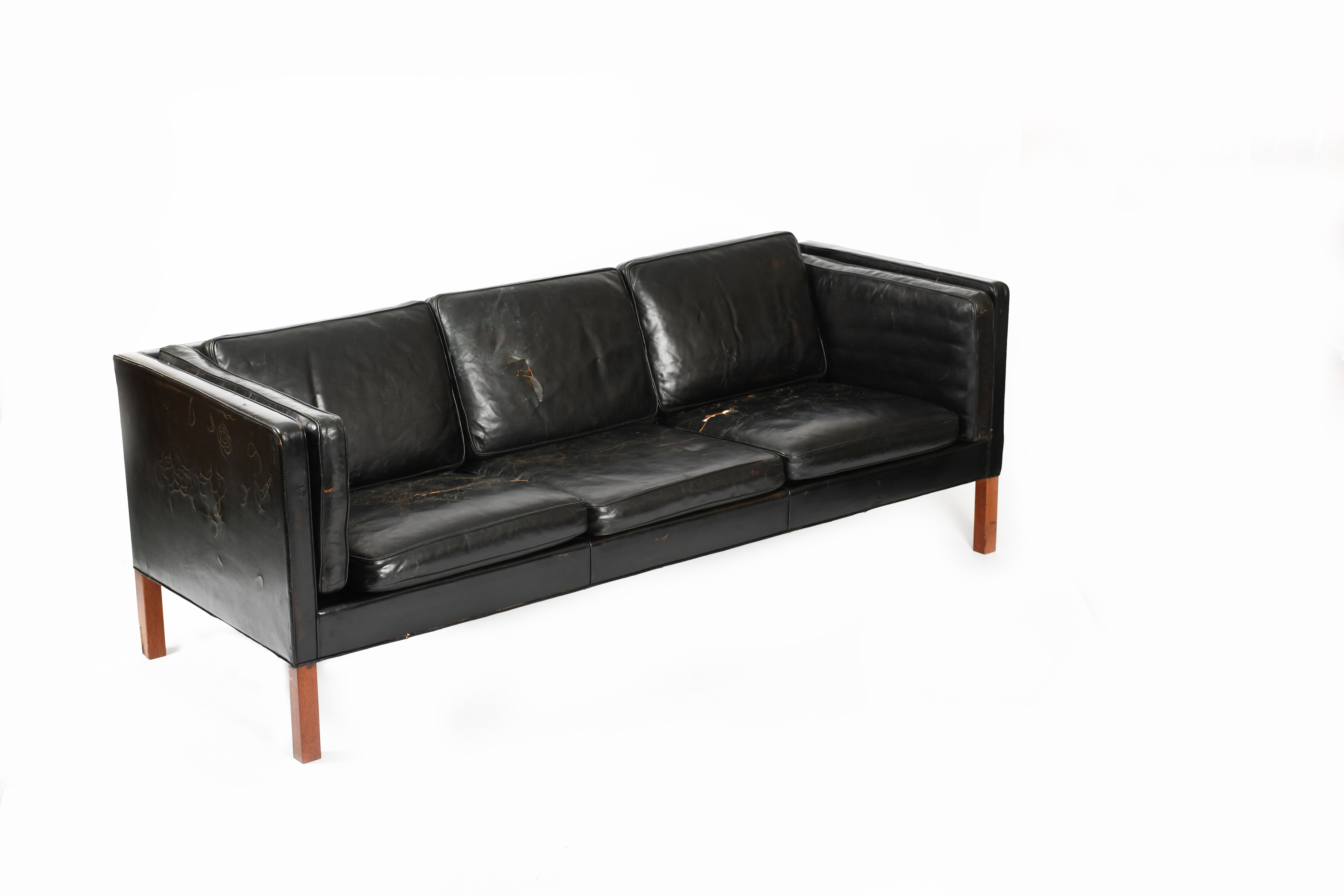 A Danish black leather three seat sofa in the manner of Borge Mogensen