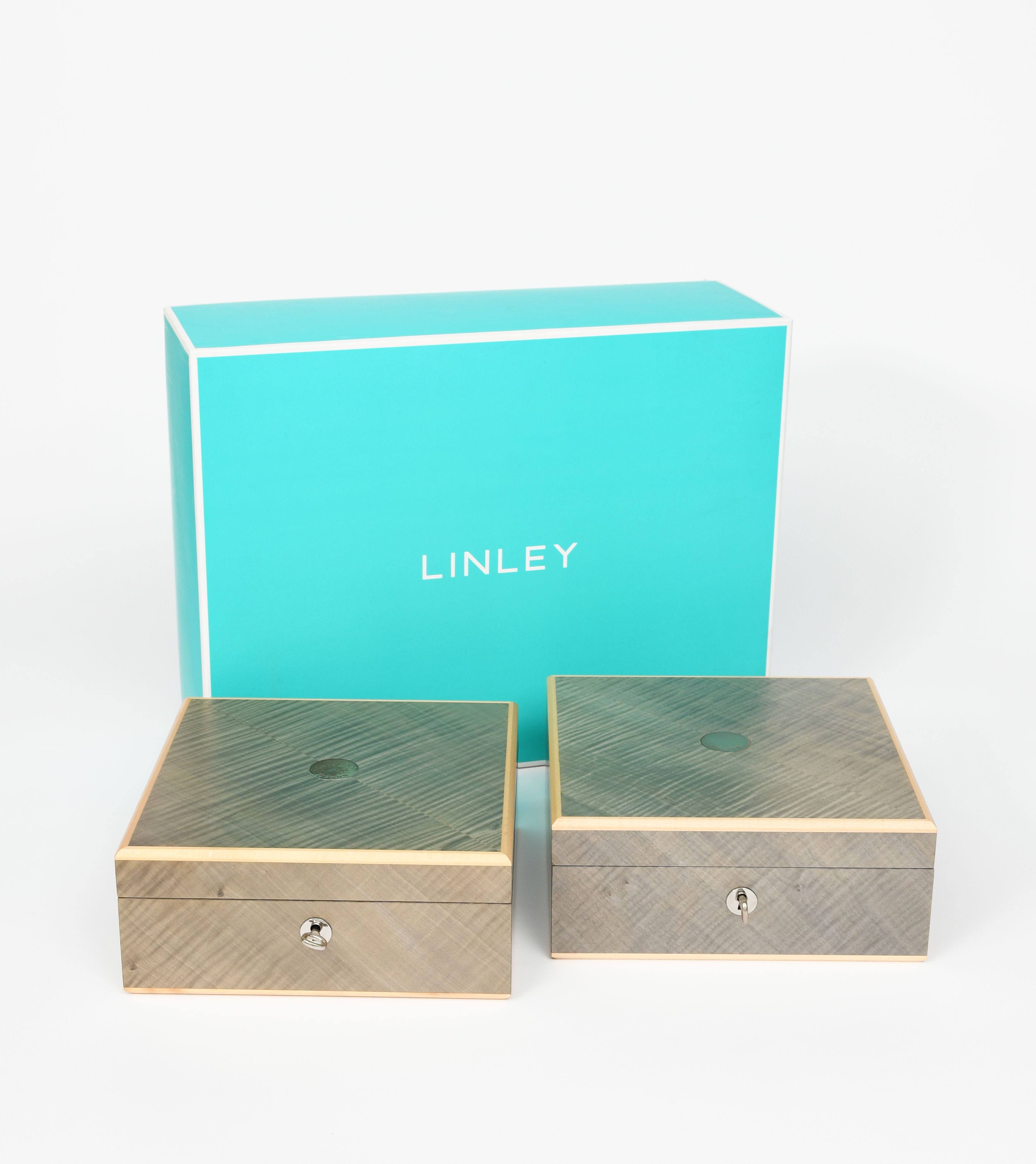 A Linley table box designed by David Linley, square section with hinged cover, exotic wood veneer set with silver round plate to cover, with divider to interior, in original presentation box, and another similar, applied Linley plaque, silver stamped DL hallmark, Edinburgh, no date mark, 23cm, square, (2)
