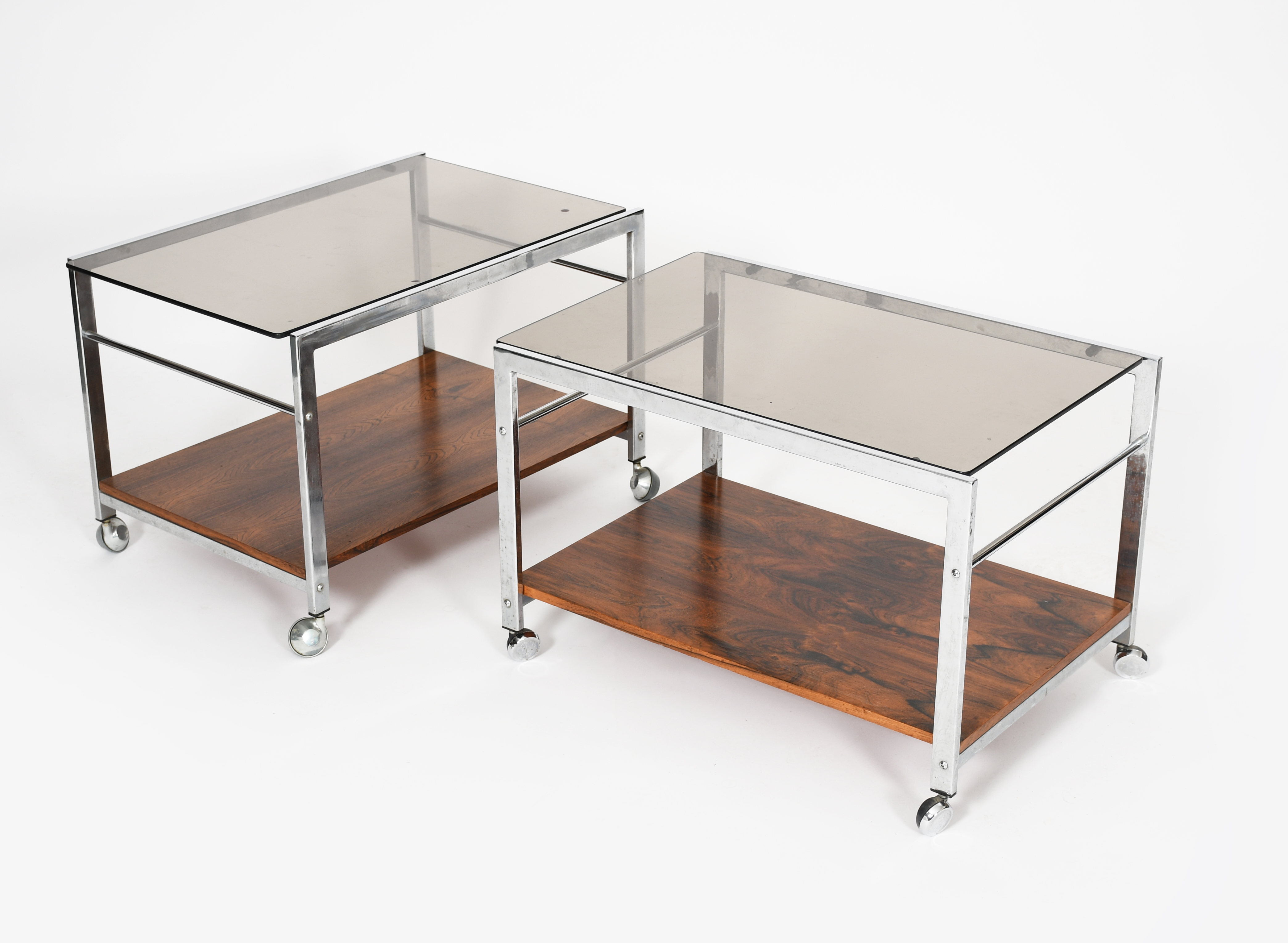 A pair of Howard Miller Ltd MDA chrome framed occasional tables, rectangular with rosewood veneer shelf and loose glass top, on castors applied factory label, 61 x 42cm, 40cm. high (4)