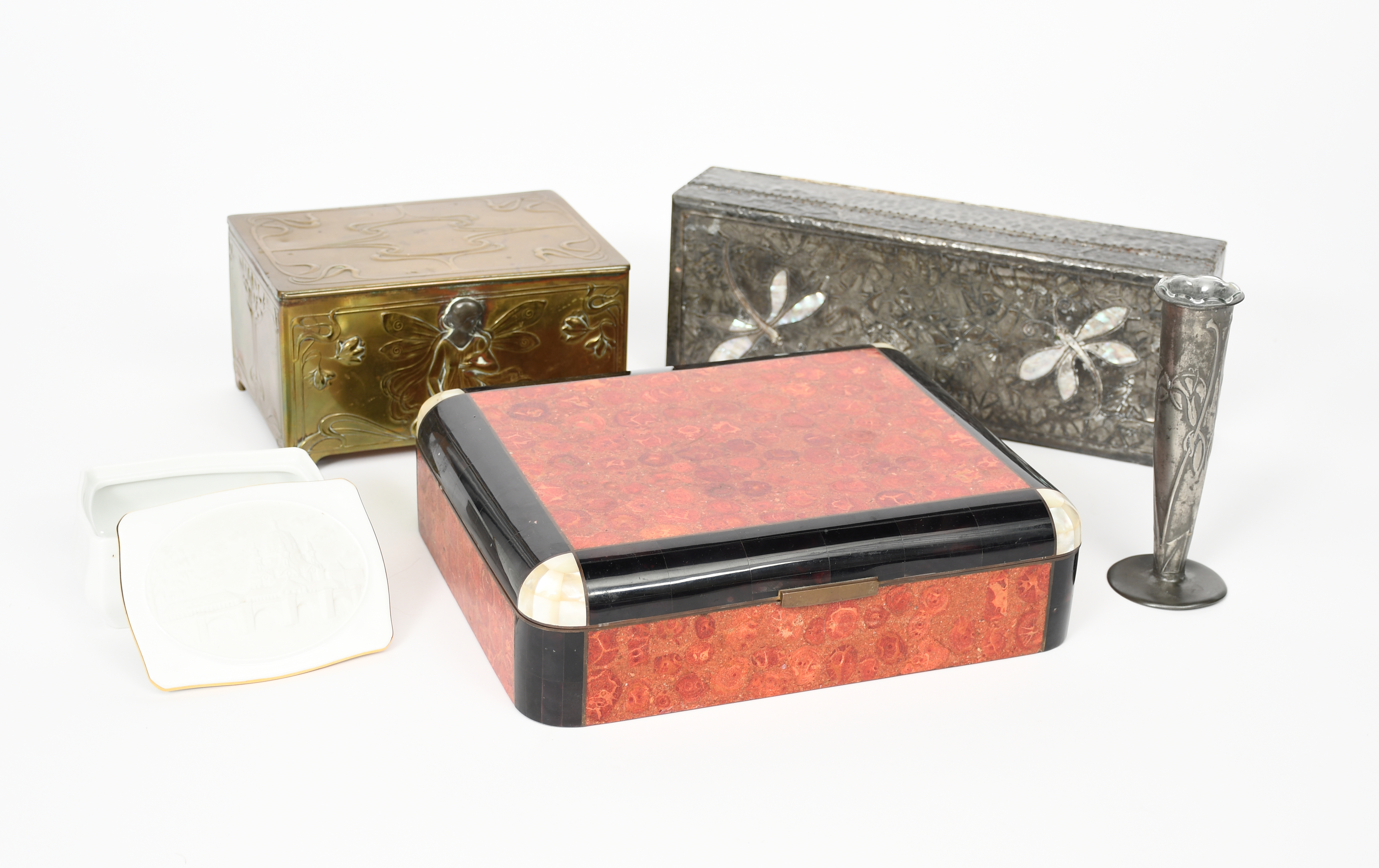 An Art Deco inlaid box with hinged cover, cedar lined, the box inlaid with red marble panels, polished slate rims with mother of pearl corners, an Art Nouveau pewter mounted box decorated with dragonflies, inlaid with mother of pearl, two other boxes and a Solkets pewter bud vase cast in low relief with flowers 28 x 22cm. (5)