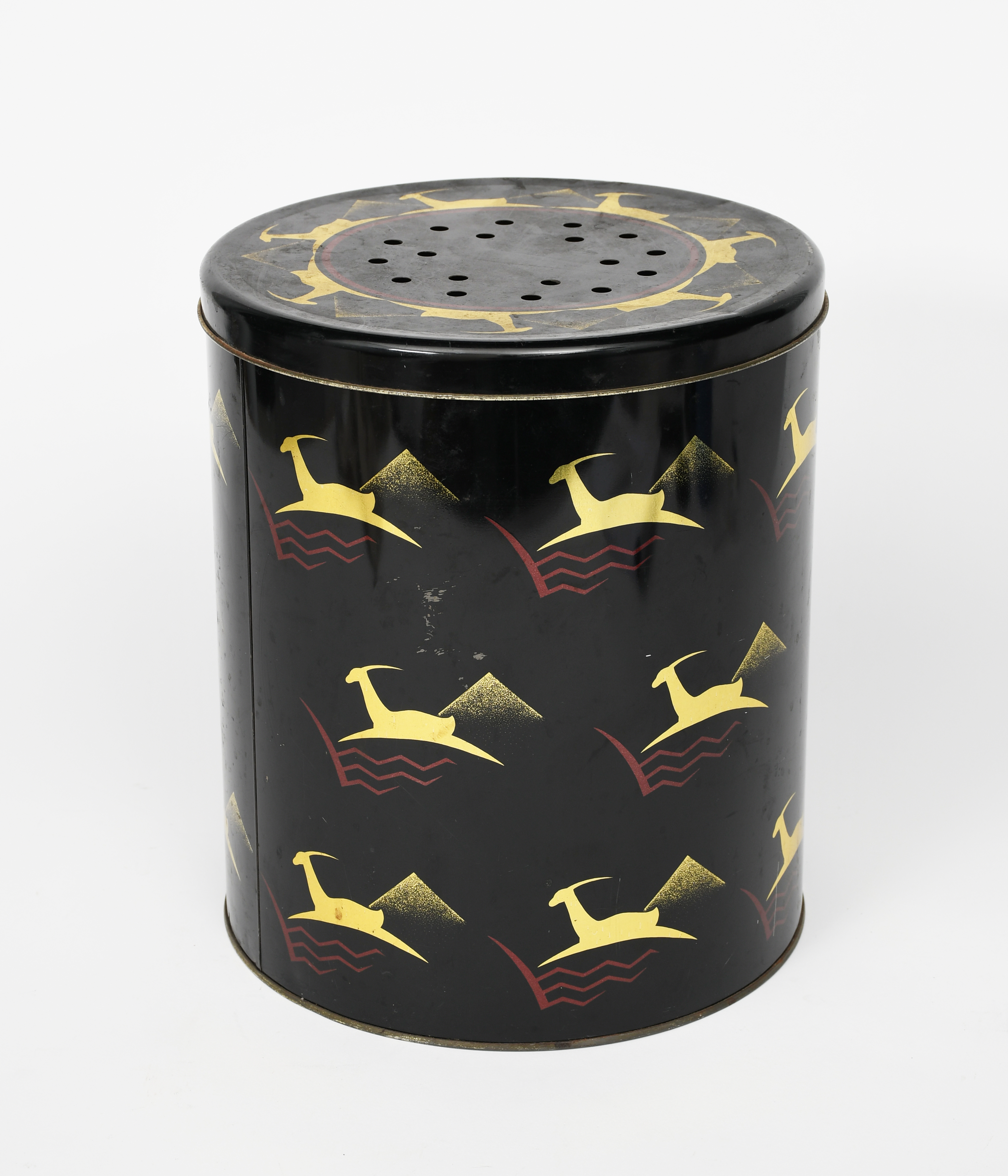 A large Biba Leaping Deer enamelled tin storage jar and cover, decorated in gilt, black and red with Art Deco revival leaping deer and pyramid design, the cover pierced for ventilation, printed Biba mark, 30cm. high
