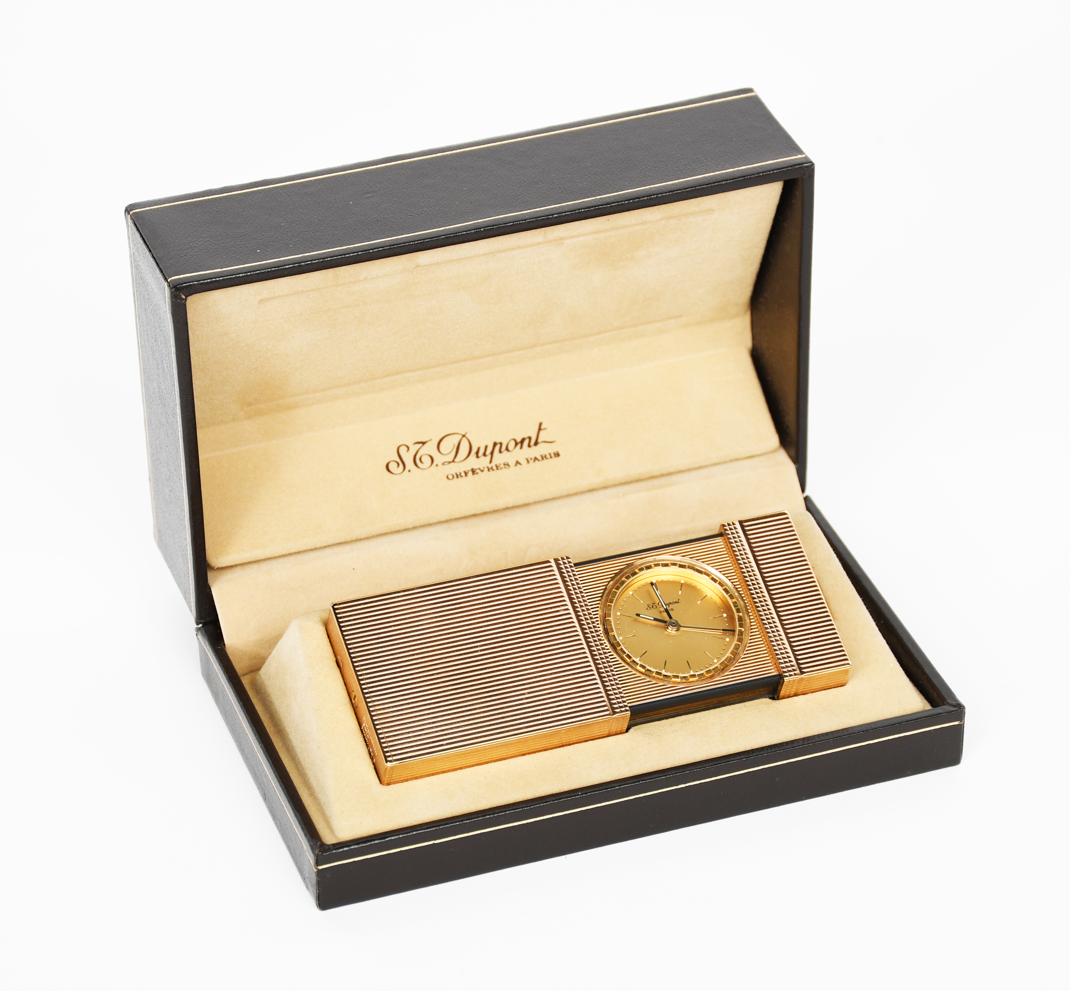 A modern S T Dupont yellow metal travel clock in original fitted presentation case