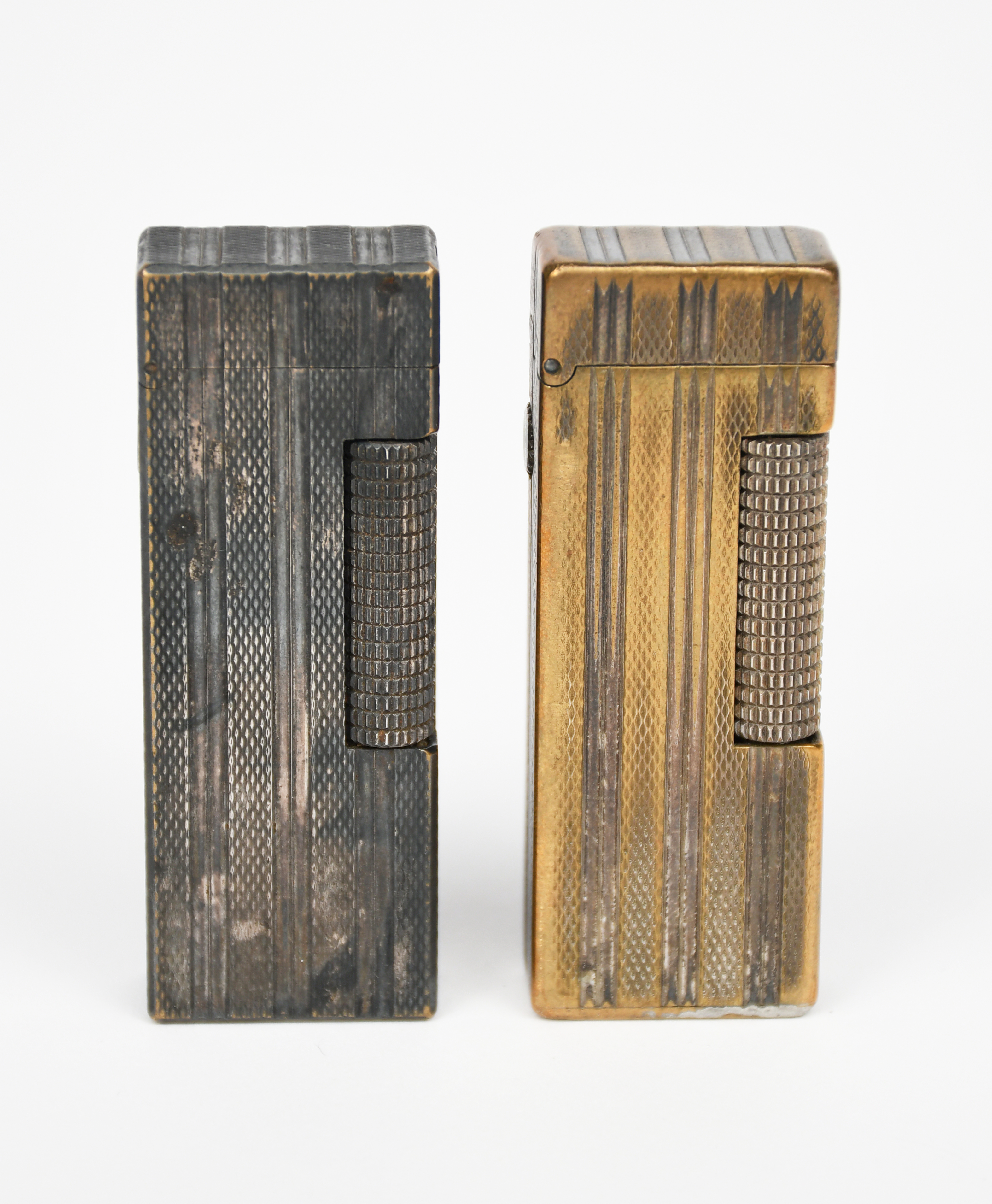 A Dunhill silver-plated lighter, rectangular with engine turned decoration, and another Dunhill engine turned lighter stamped marks, 6.5cm. long, (2)