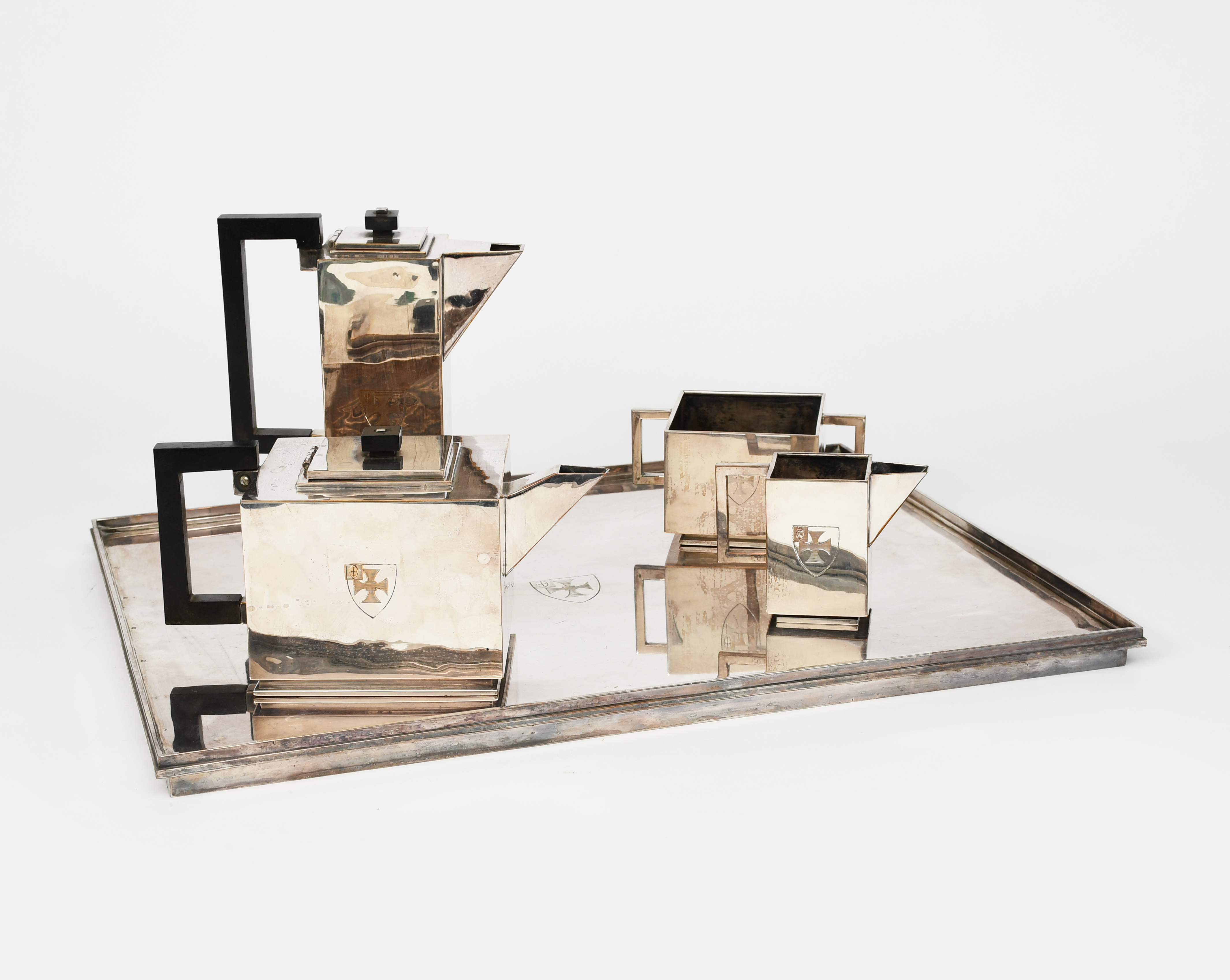 A Charles Boyton Modernist electroplated four piece tea service on tray, square section on stepped foot with stepped shoulder, comprising teapot and hinged cover, hot-water pot and hinged cover, milk-jug and sugar basin, on a rectangular tray, teapot and hot-water pot with ebonised wood handles, each with engraved cross in shield for Bede College Durham University, unsigned, 21cm high (hot-water pot), 50 x 38cm (tray) (5)