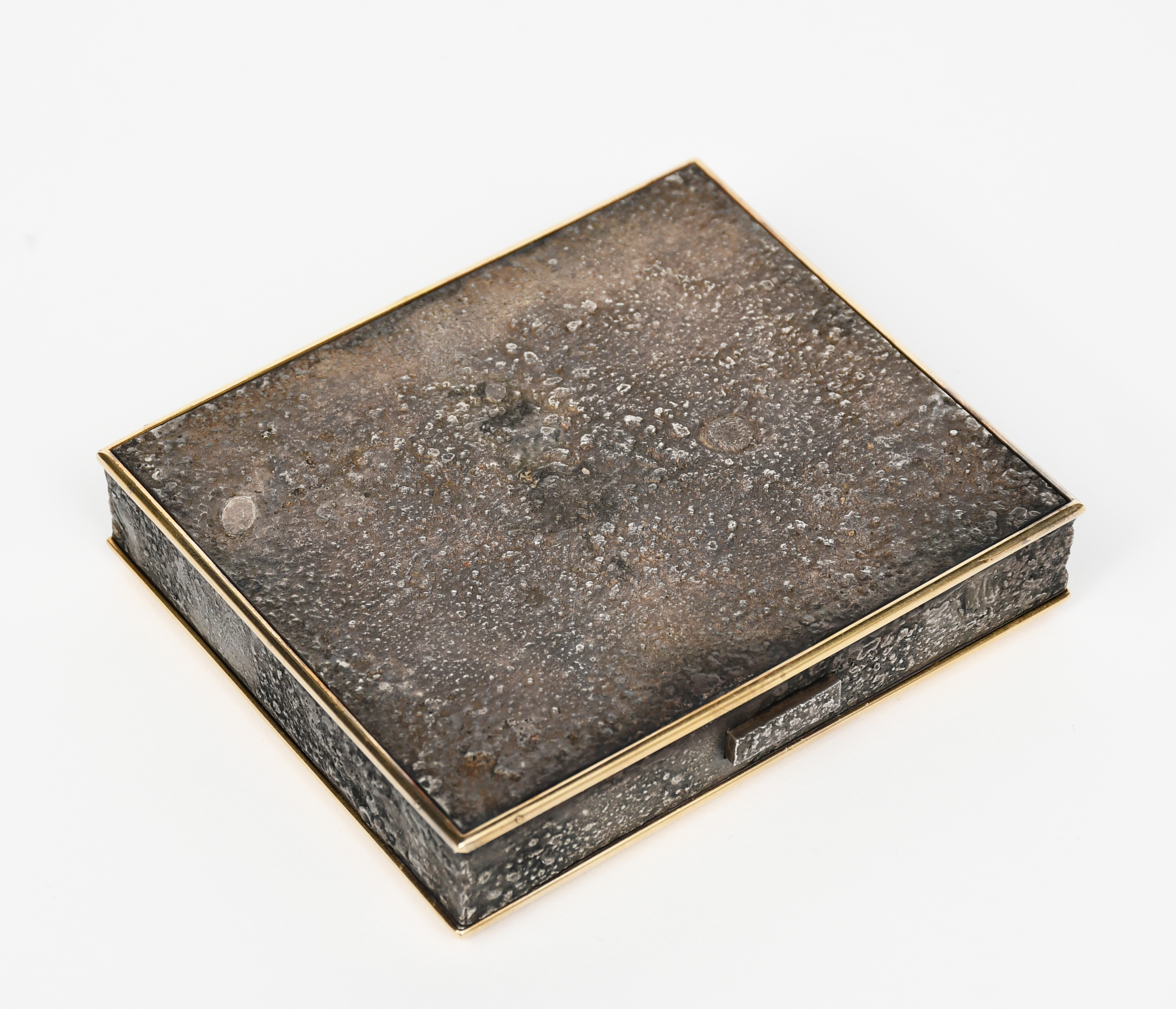 A Line Vautrin silver and bronze minaudiere, rectangular form with hinged cover, textured finish, the interior fitted with mirror housing, two open powder compartments and and compartment with hinged cover, with fitted leather travel cover, stamped Minerva head mark, unsigned, 9.7 x 8.2cm.