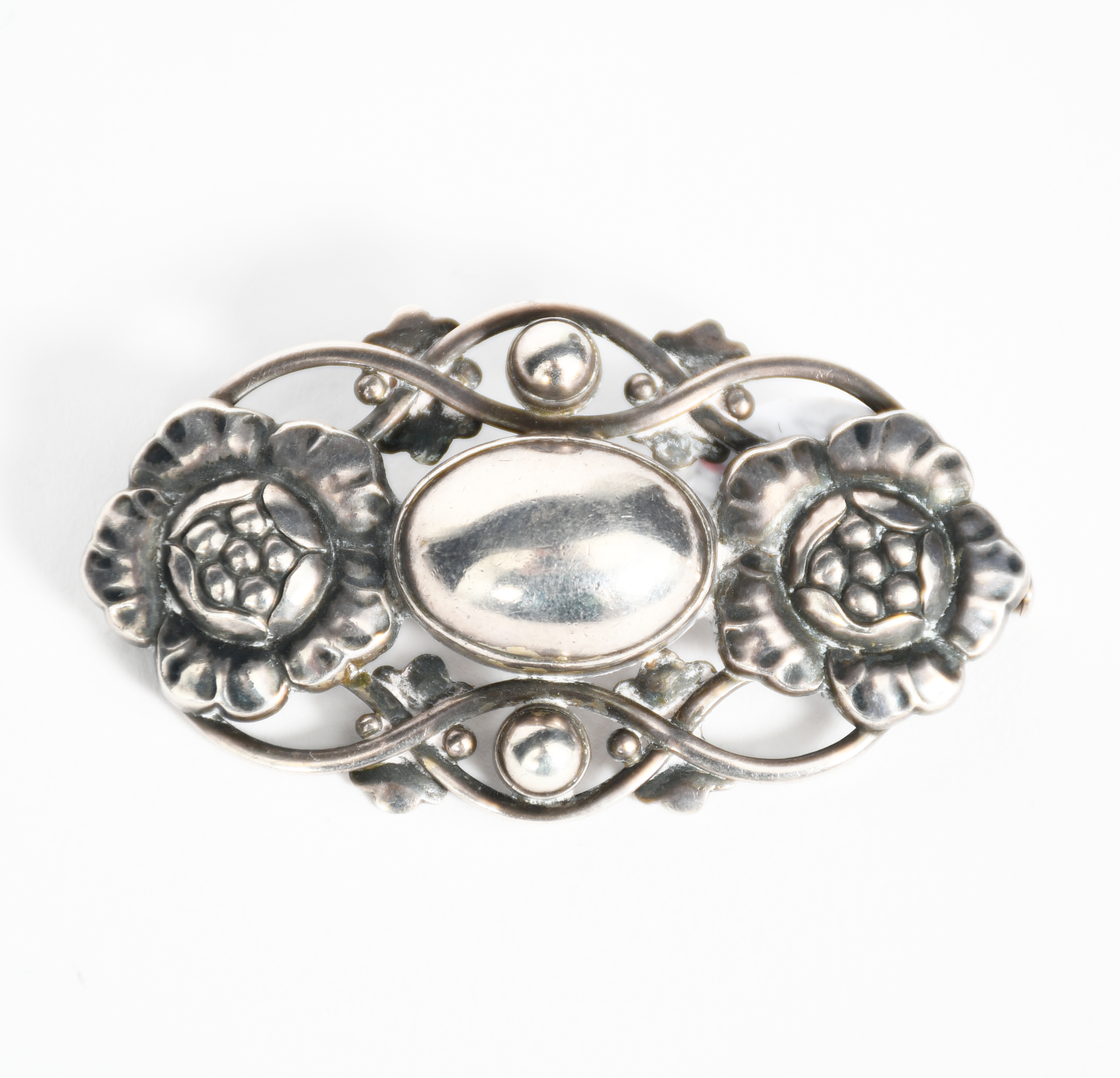A Georg Jensen silver brooch designed by Georg Jensen, model no.89, pierced and cast with flowerheads flanking central dome, and wirework border, stamped marks, 5.3cm. wide