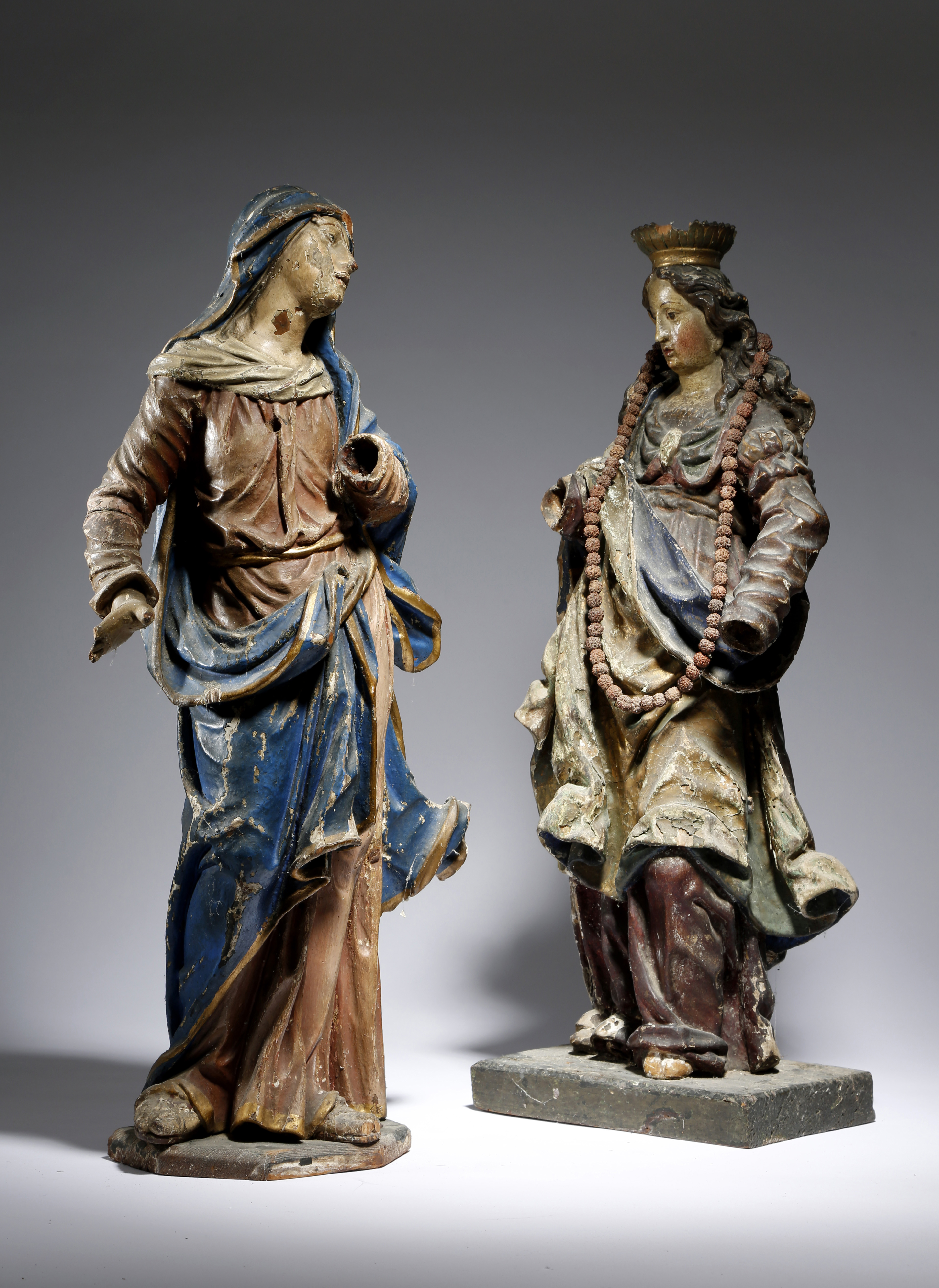with parcel gilt decoration, one of the Virgin Mary, one wearing a crown (2)
