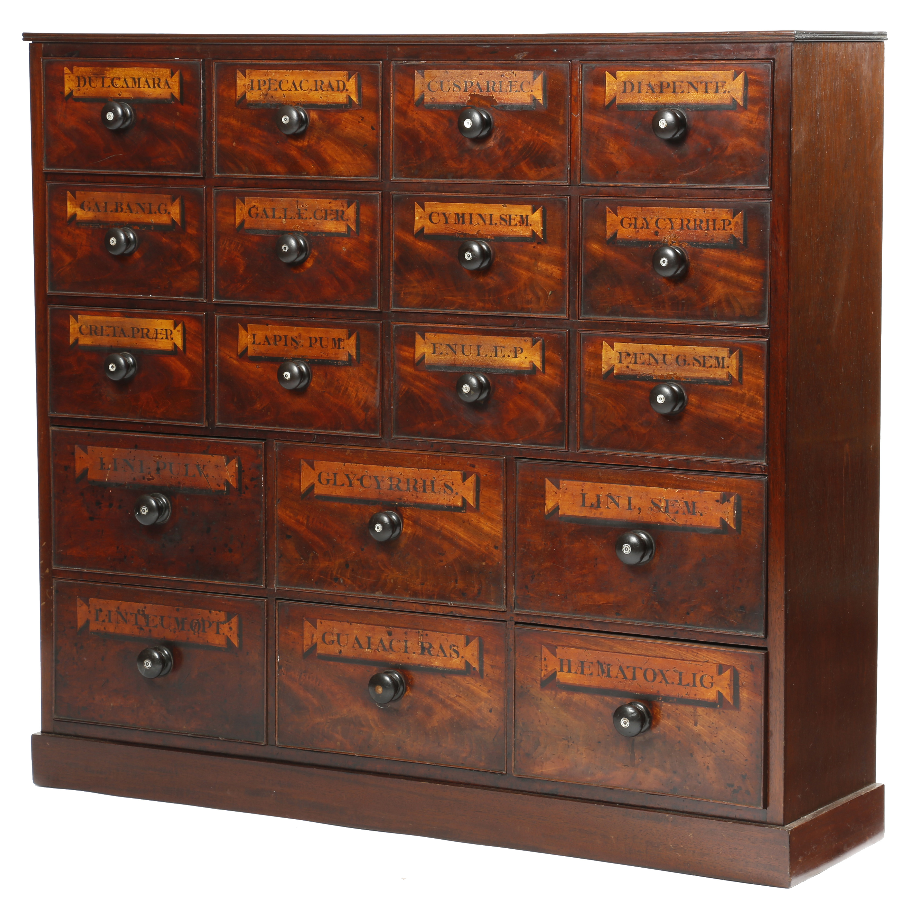 A BANK OF MAHOGANY APOTHECARY DRAWERS