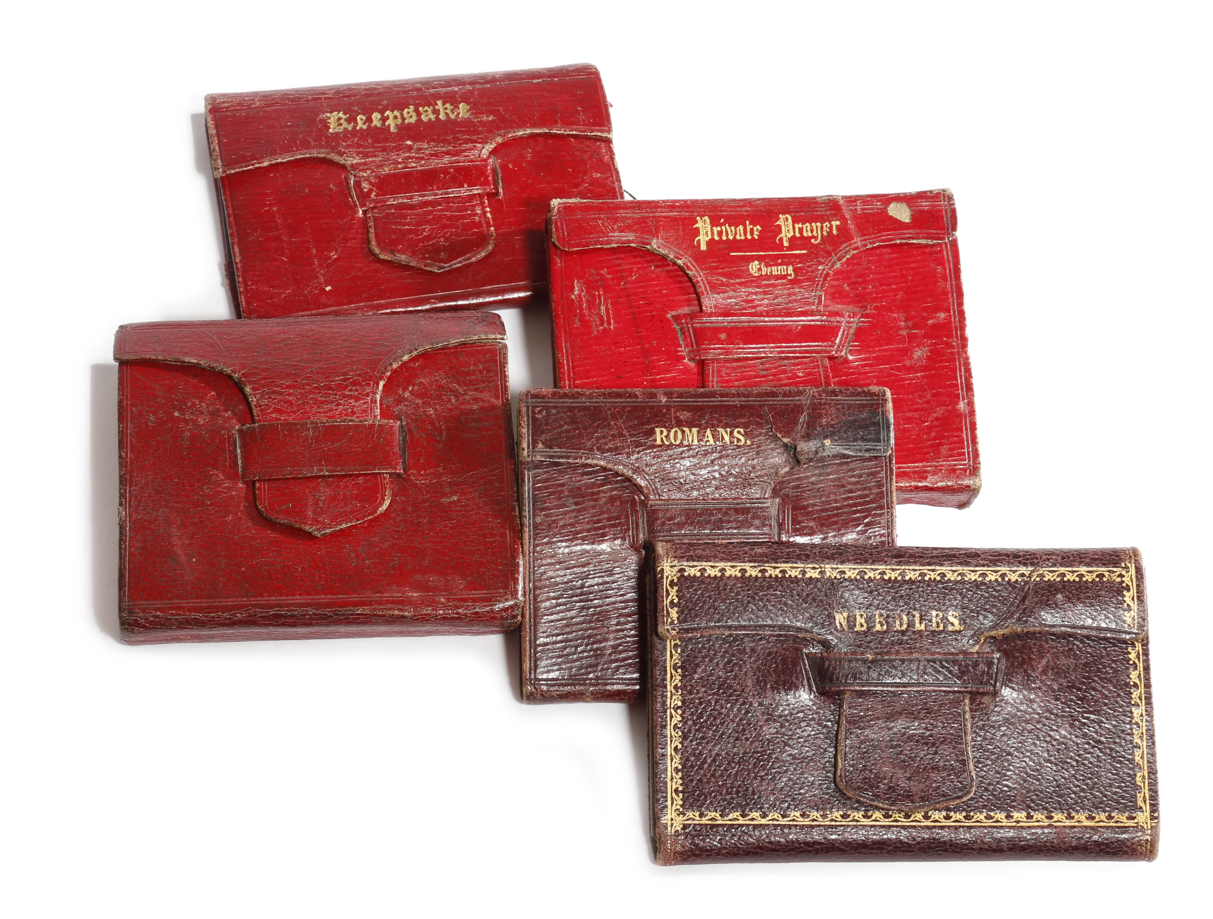comprising: three red examples one inscribed 'Keepsake' and fitted for needles, one containing a religious book 'Daily Food for Christians', inscribed in pencil 'Anne Warburton, Littleborough Feb. 21st 1831', the last inscribed in gilt 'Private Prayer Evening' containing a prayer book published in 1853, together with two maroon examples, one inscribed 'Romans' containing 'The Epistle of Paul the Apostle to the Romans 1833', with printed trade label for 'T.D. Clark, Bookseller and Stationer, 17 St. Michaels Hill, Bristol', the other 'Needles' containing a pouch (5)