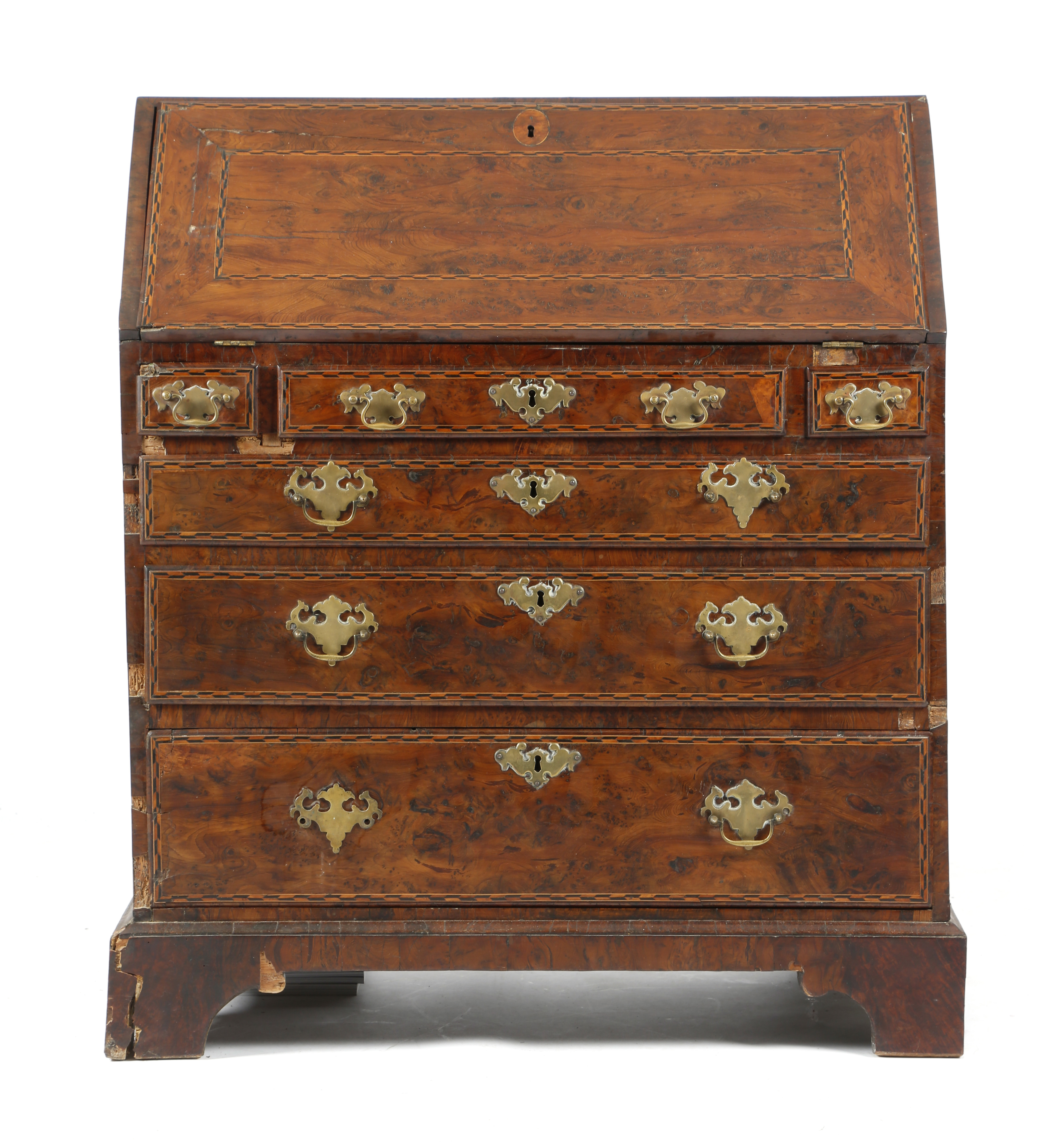 AN EARLY GEORGE III YEW BUREAU C.1760-70 inlaid with chevron stringing