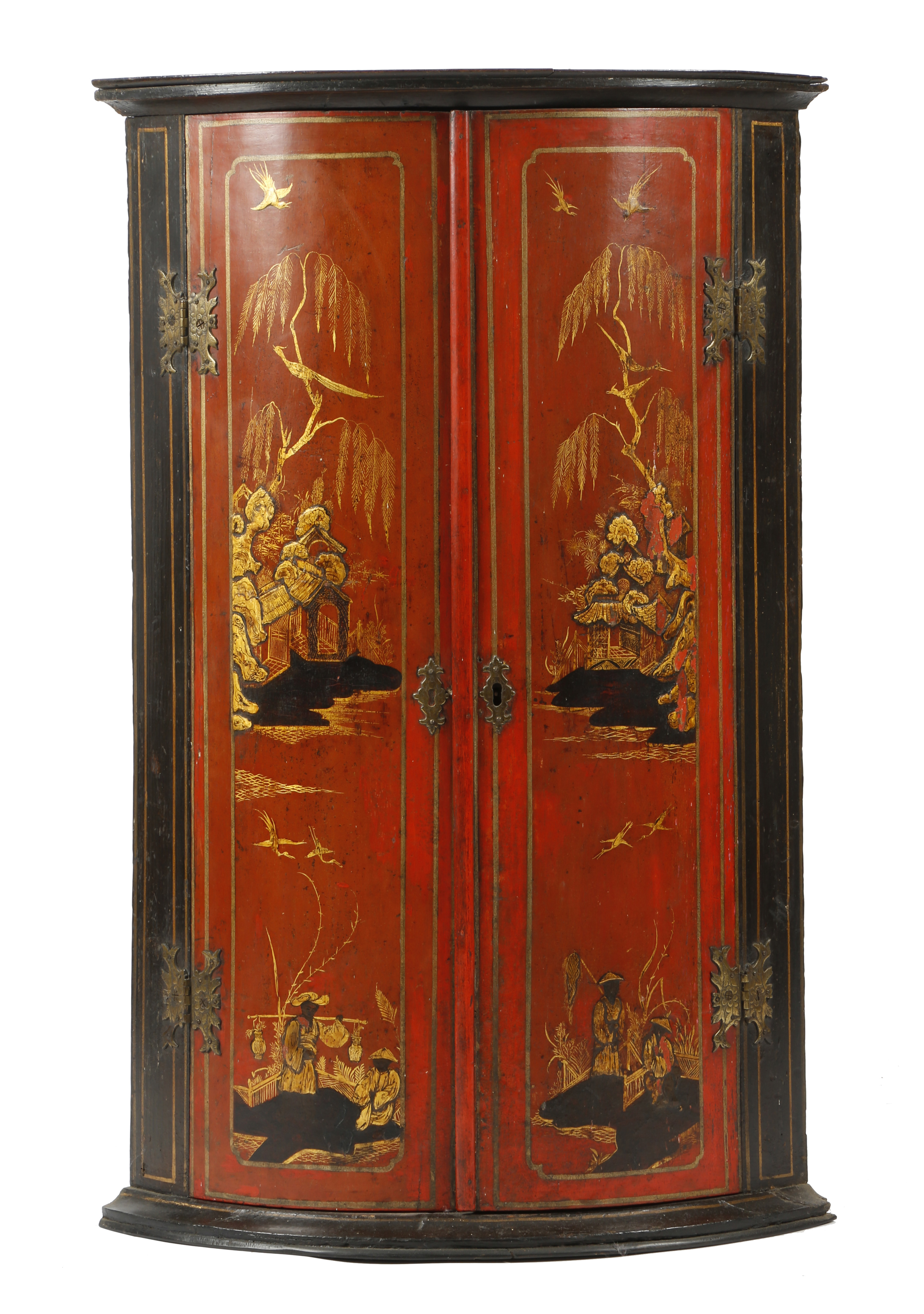 A GEORGE II JAPANNED BOWFRONT HANGING CORNER CUPBOARD MID-18TH CENTURY the red lacquer doors...