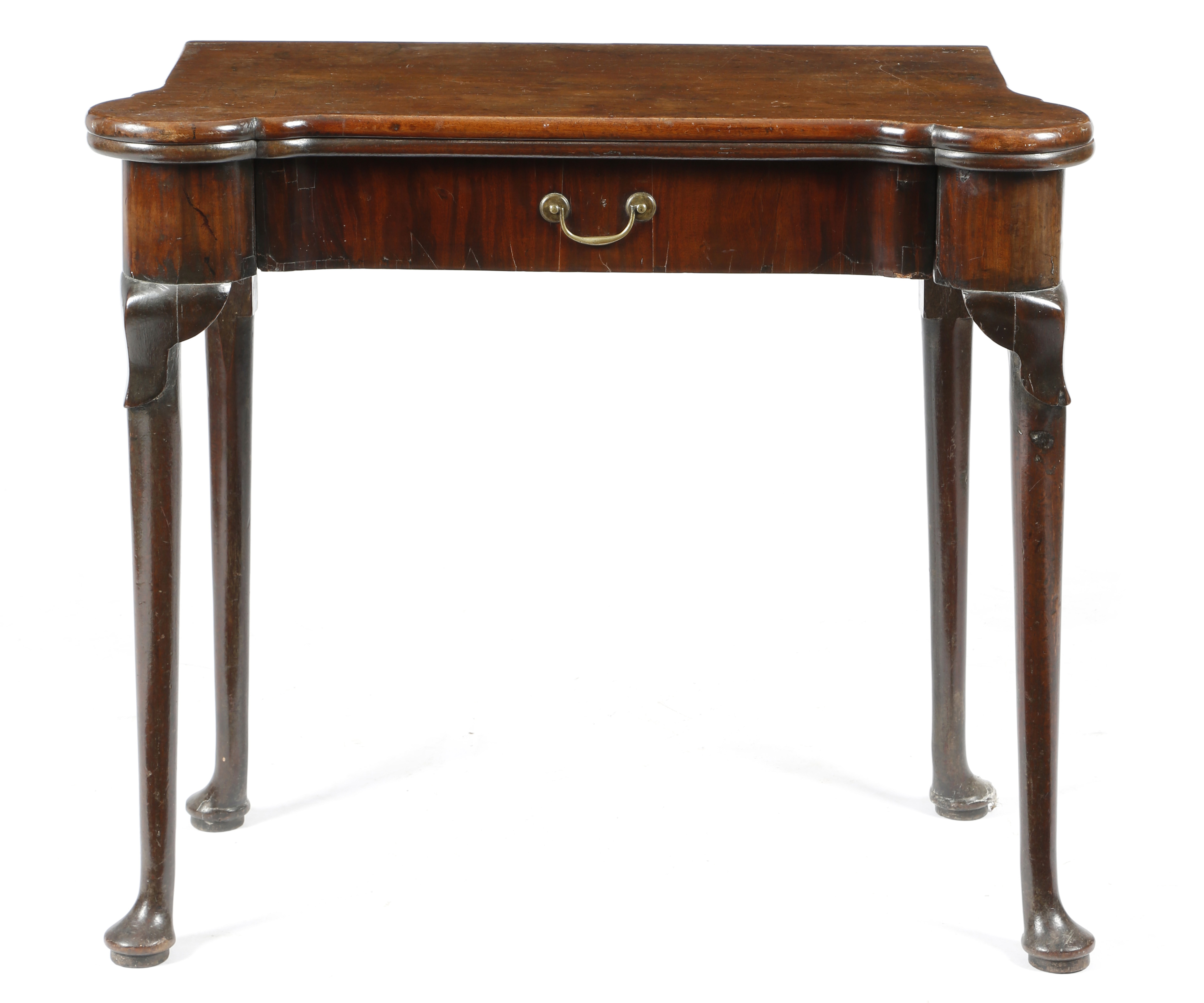 A GEORGE II RED WALNUT TEA TABLE C.1740 the hinged top with protruding corners revealing four...
