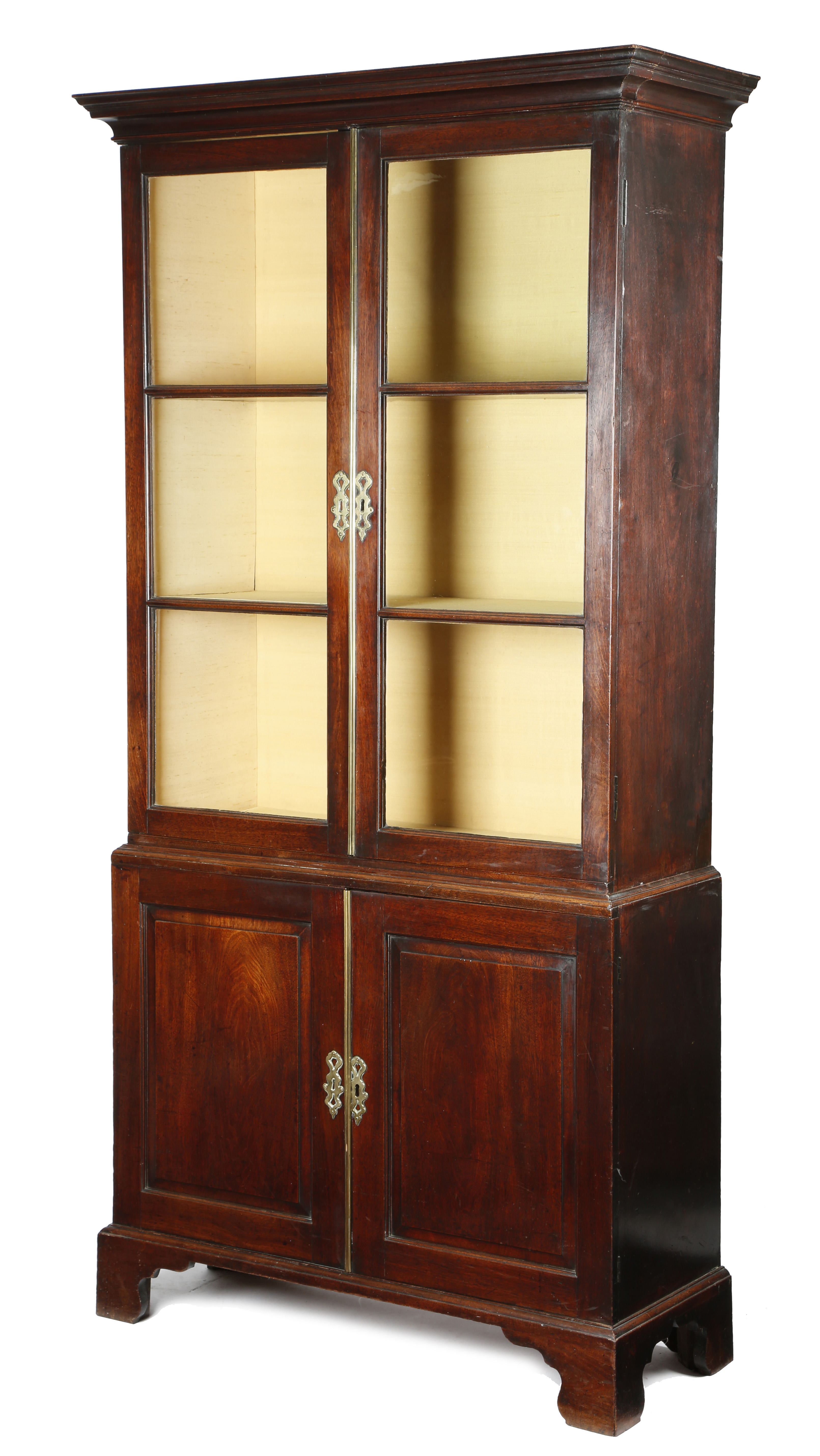 the moulded cornice above a pair of astragal glazed doors enclosing a silk lined interior, with two fixed shelves, above a pair of fielded panel doors, on shaped bracket feet