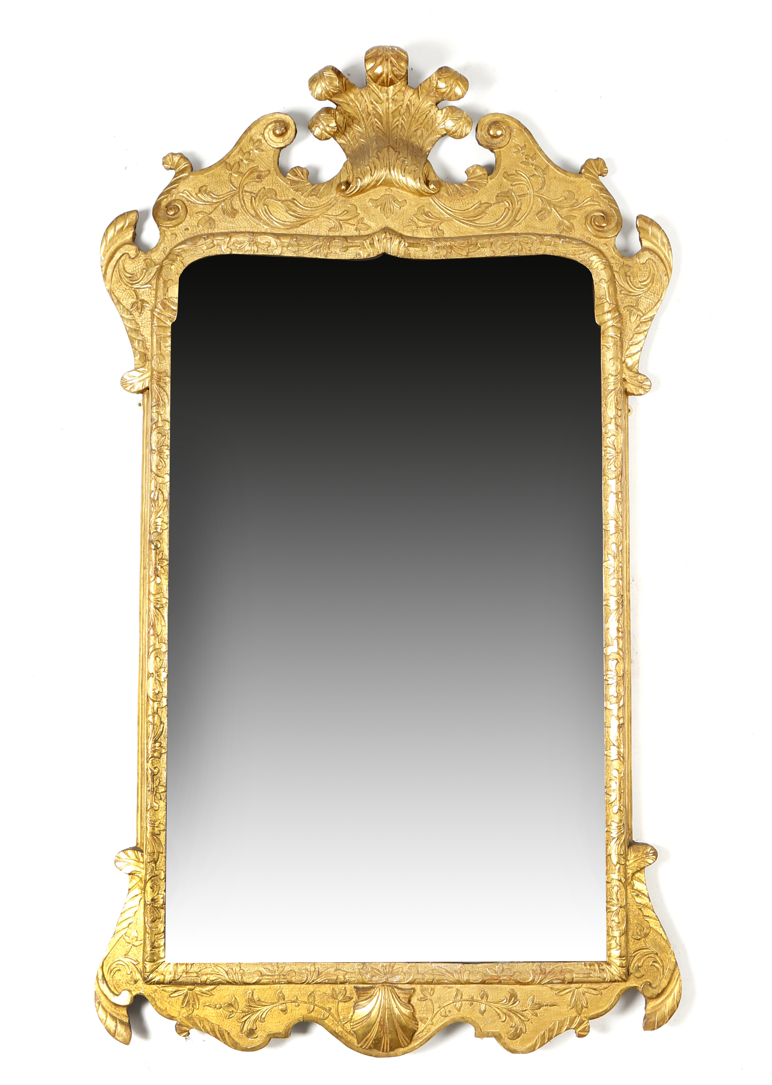 A GEORGE I GILTWOOD WALL MIRROR C.1720-25 the arched bevelled plate within a relief carved leaf...