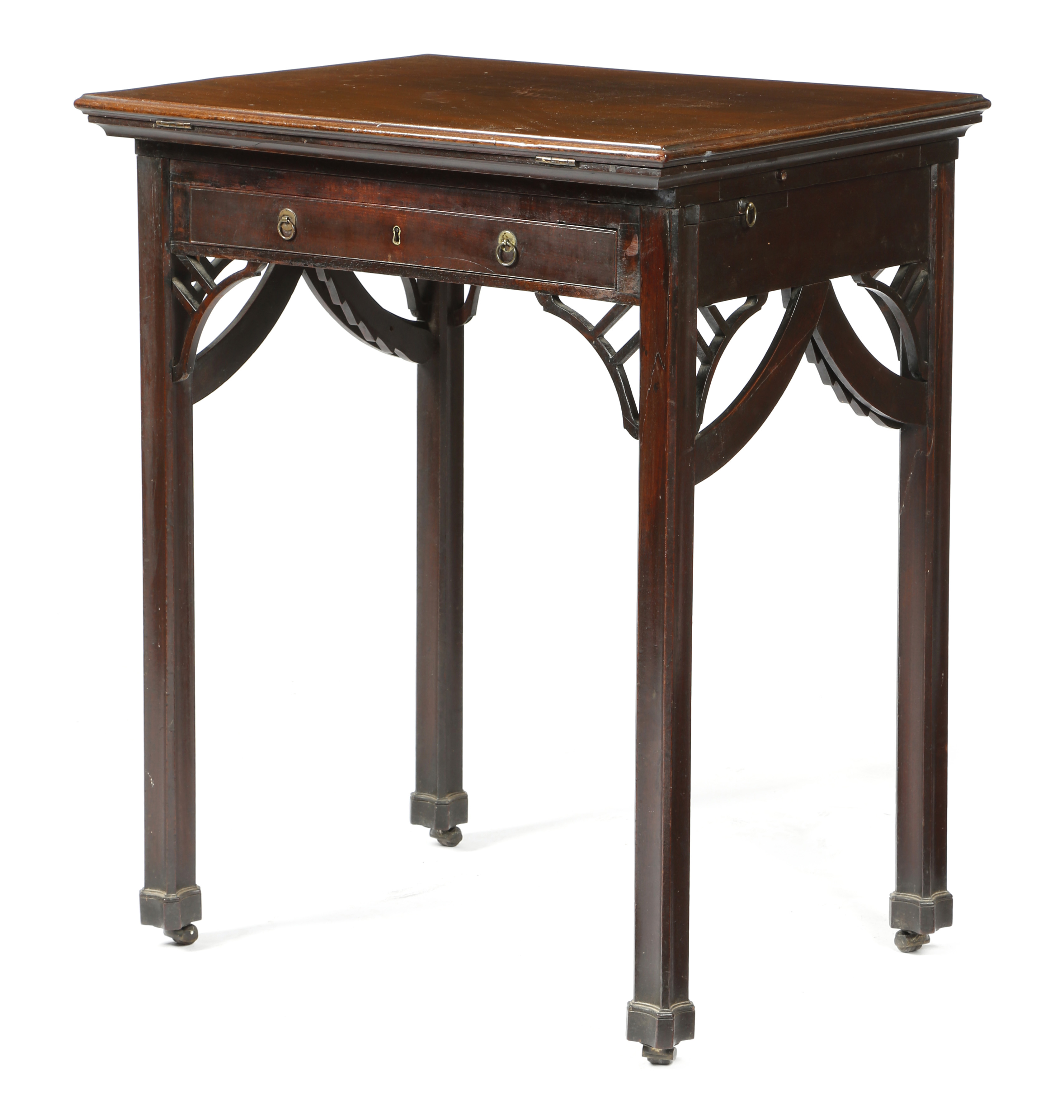 the moulded edge hinged top formally with a rest, on a twin ratchet support, with a frieze drawer fitted with a baize lined sliding cover, the sides with pull-out candle slides, above fret brackets and stylised swags which disguise the mechanism for one of the ratchet's, on in-curved legs and leather roller castors