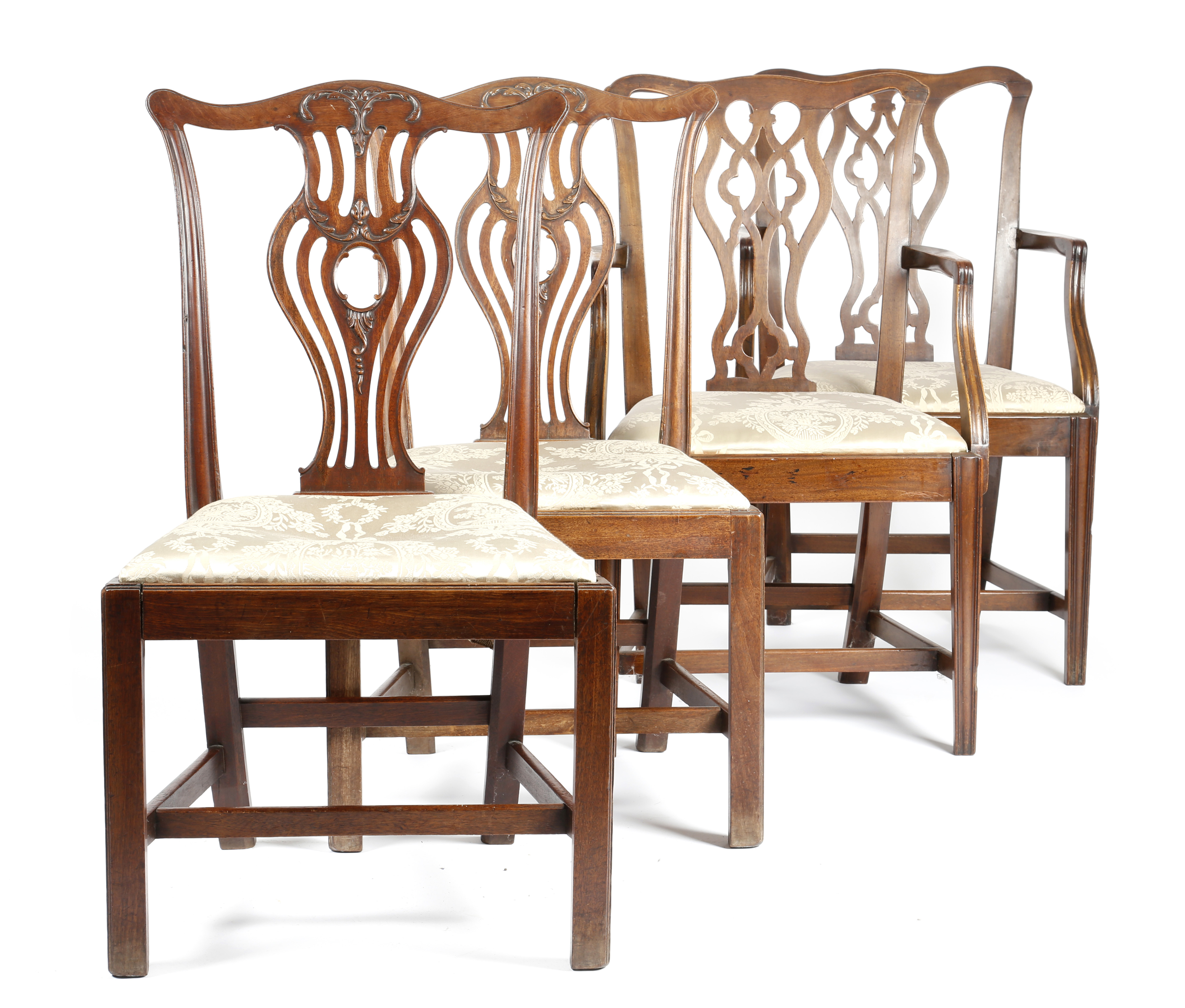 each with a serpentine top rail, above a finely carved scrolling leaf and 'C' scroll decorated pierced vase splat, above a drop-in seat, on moulded and chamfered front legs, united by an 'H' stretcher, together with a pair of George III mahogany open amchairs (4)