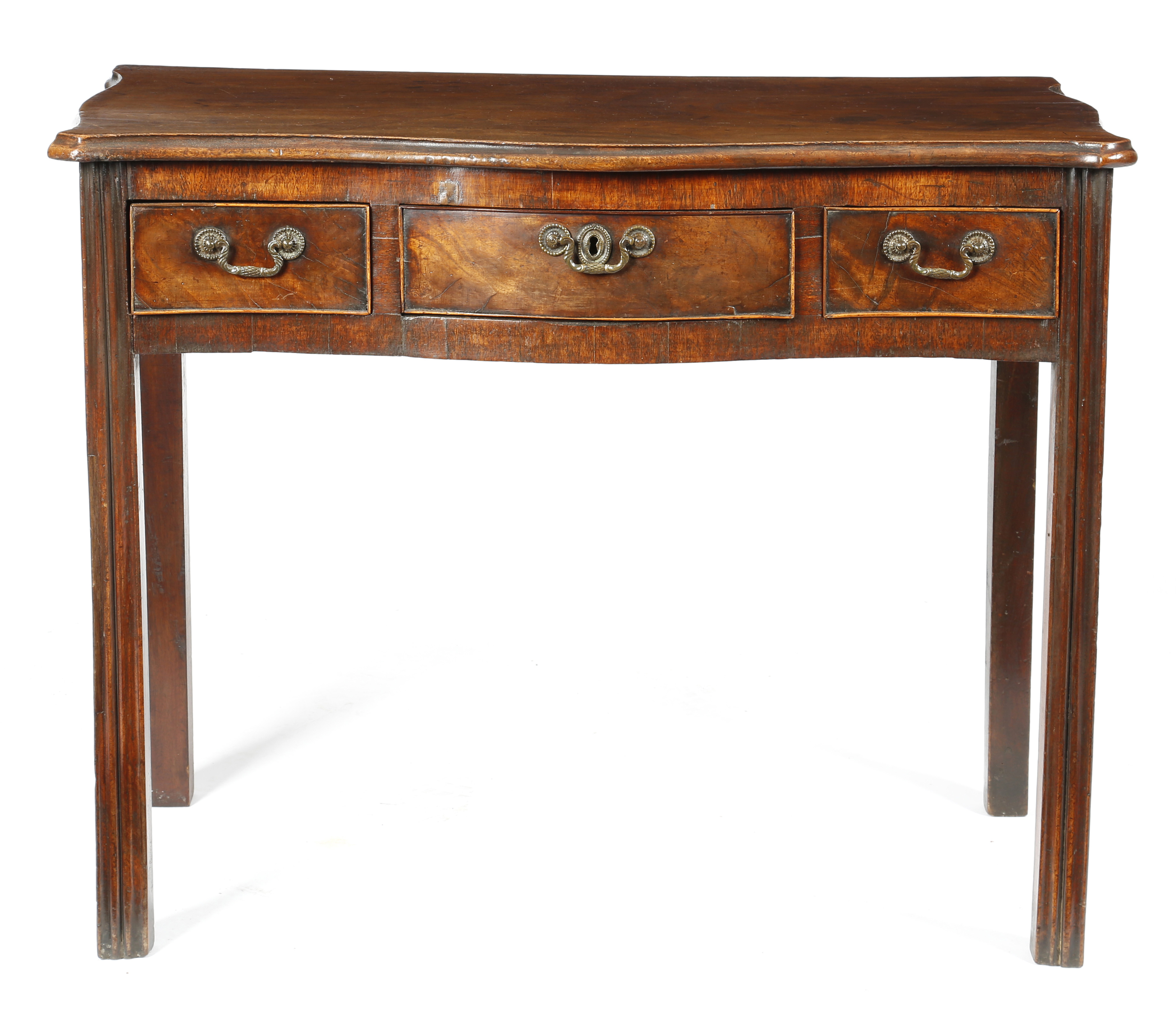 A GEORGE III MAHOGANY SERPENTINE SIDE TABLE C.1770 the moulded edge top above three frieze drawers