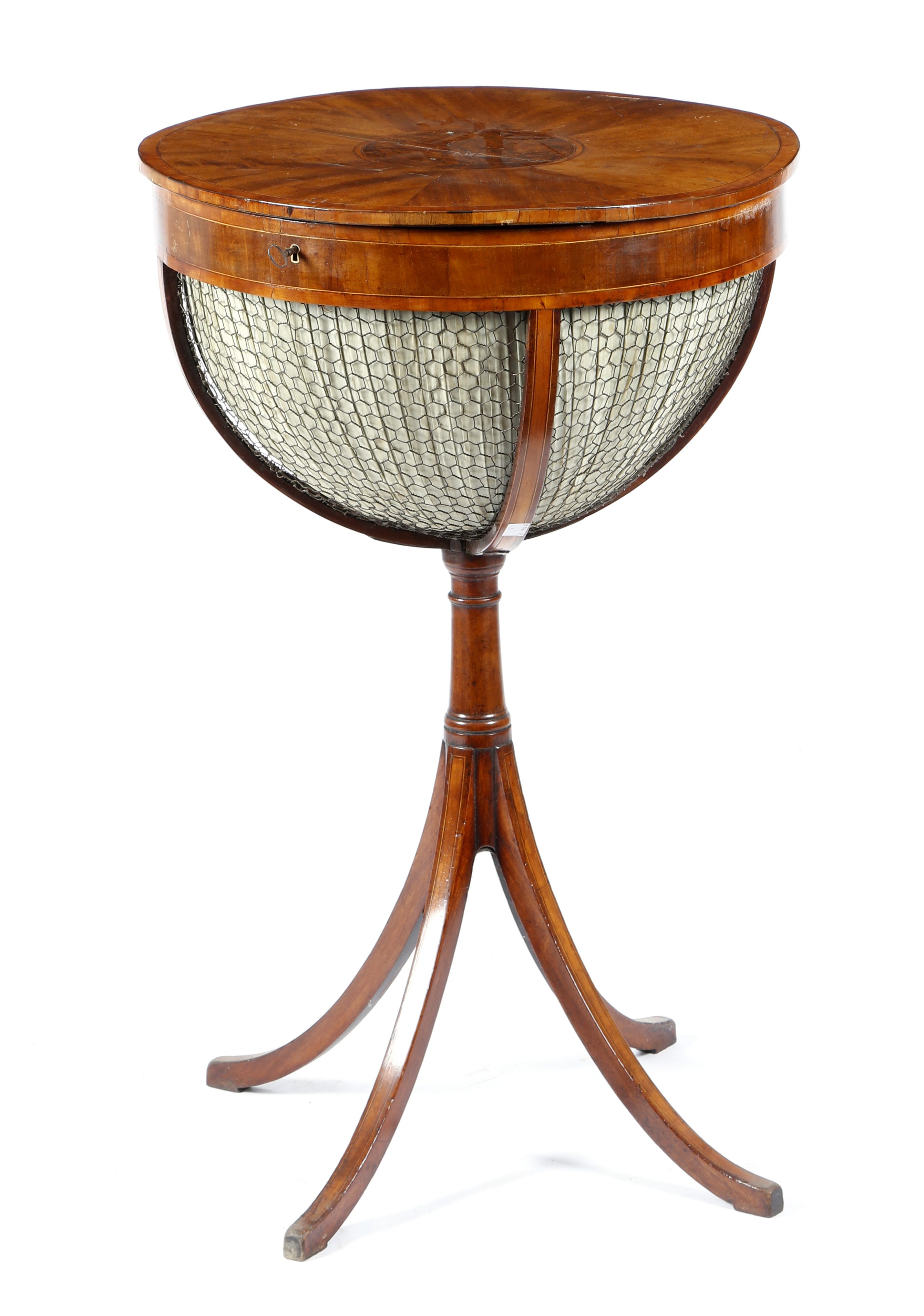 inlaid with stringing and satinwood crossbanding, the circular swivel top centred with a burr yew panel, above a wirework and silk lined basket, on a turned stem and four swept legs