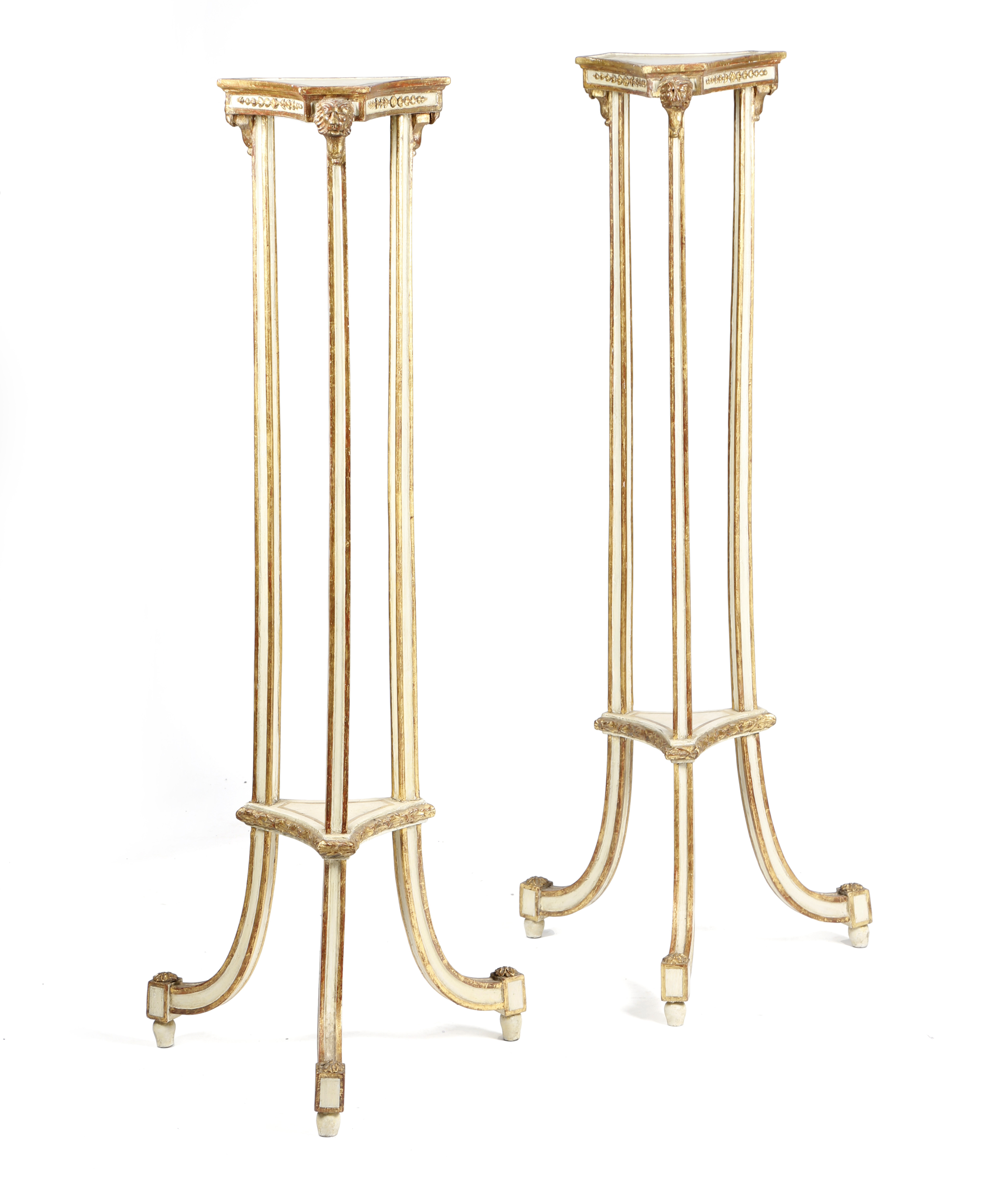 A PAIR OF GEORGE III CREAM PAINTED AND PARCEL GILT TORCHERES C.1790 of open concave form