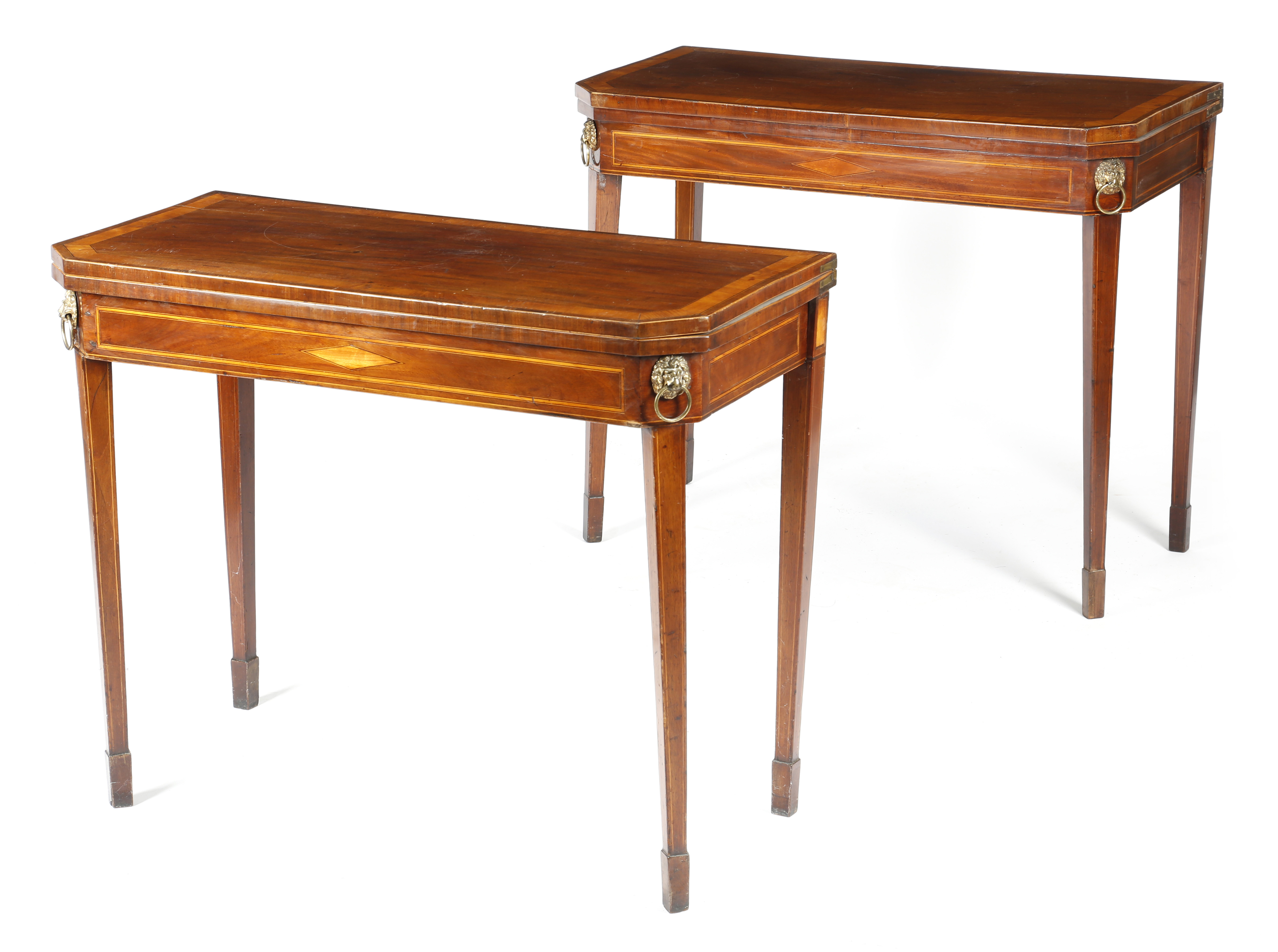 each with a rectangular fold-over top with canted front corners and crossbanded with satinwood and rosewood, revealing a baize lined surface, on twin gate supports, the frieze inlaid with a lozenge and applied with brass lion's masks, on square tapering legs and spade feet (2)