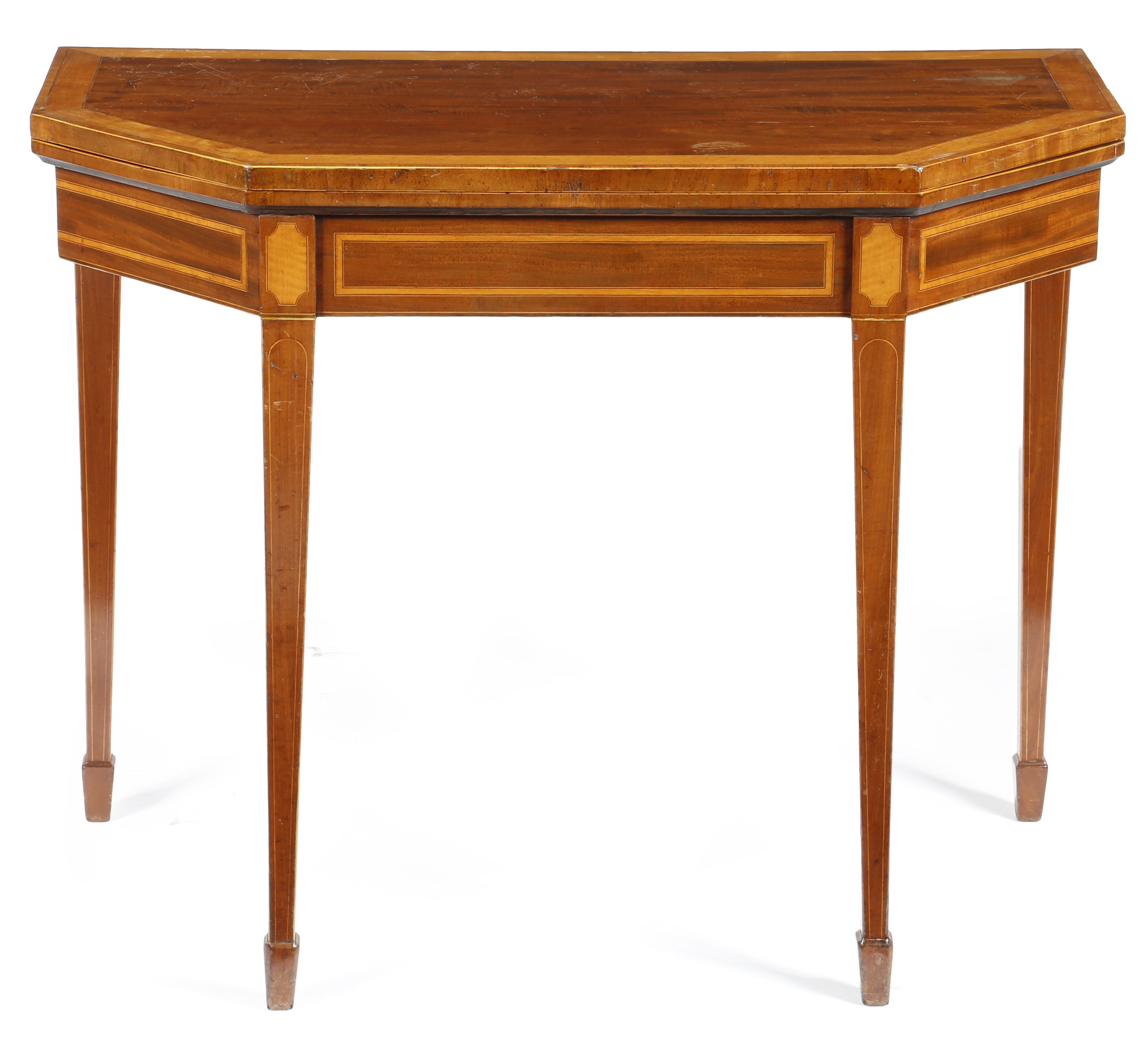 of canted form, the fold-over top banded in rosewood and satinwood, on twin gate supports