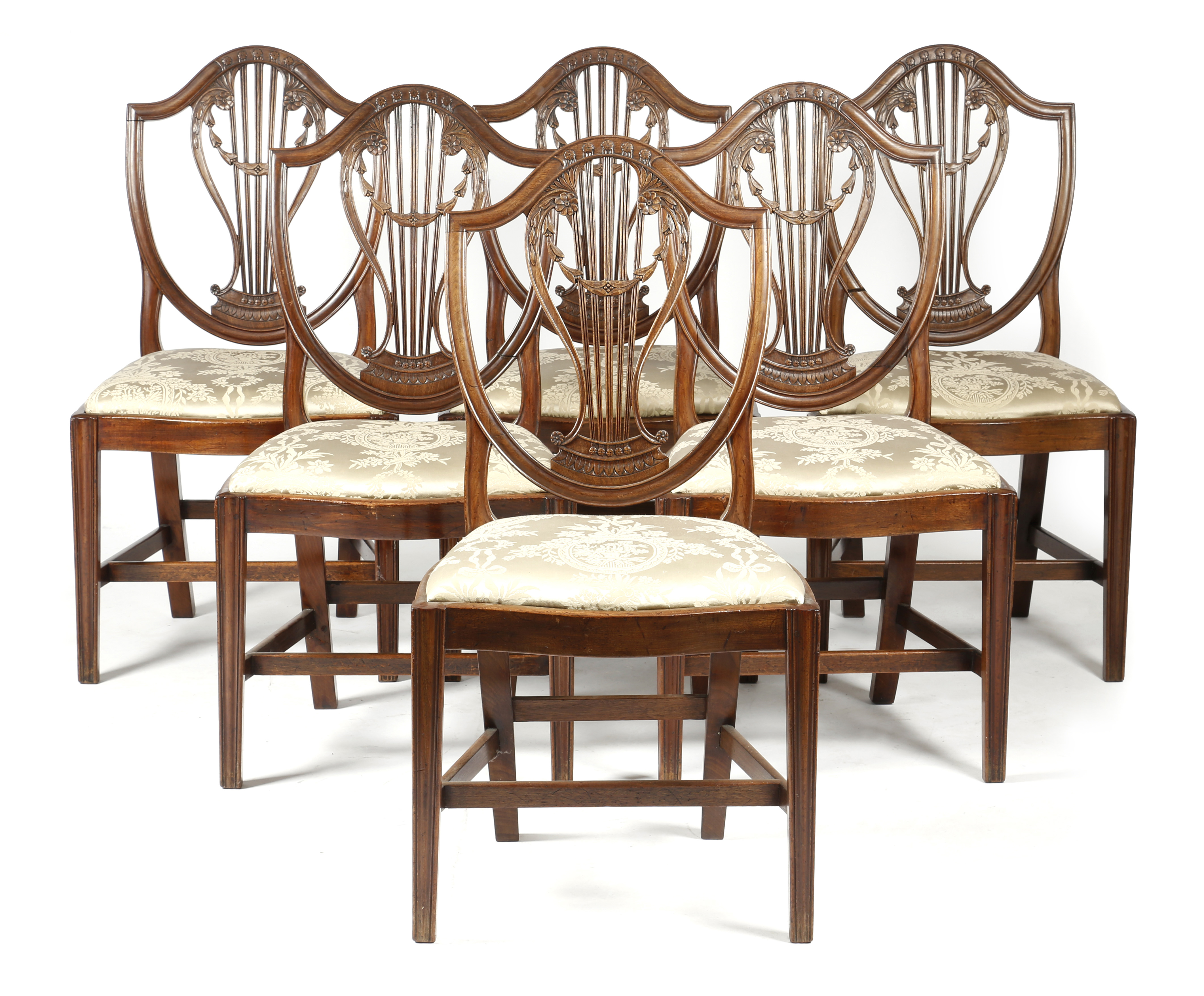 each with a shield back, the channelled outer frame carved with flowerheads, with a lyre shaped splat decorated with laurel swags, flowers and stiff leaves, above a serpentine front drop-in seat, on moulded front legs united by an 'H' stretcher (6)