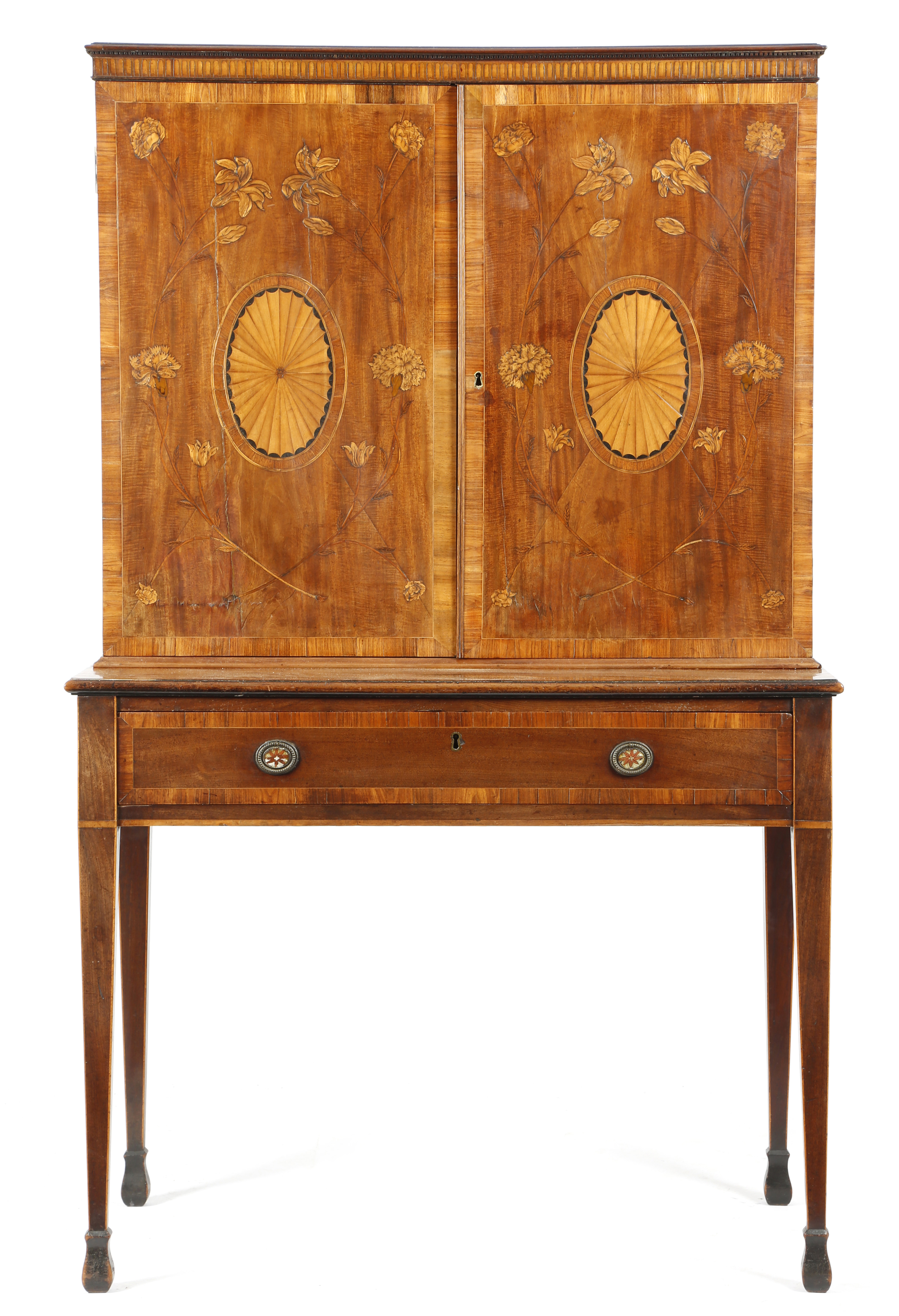 with an inlaid faux fluted frieze, with a pair of kingwood banded doors inlaid with fan paterae and lilies and chrysanthemums, enclosing an interior with fourteen drawers and a central cupboard door, the base with a divided frieze drawer with painted handles, on square tapering legs and spade feet