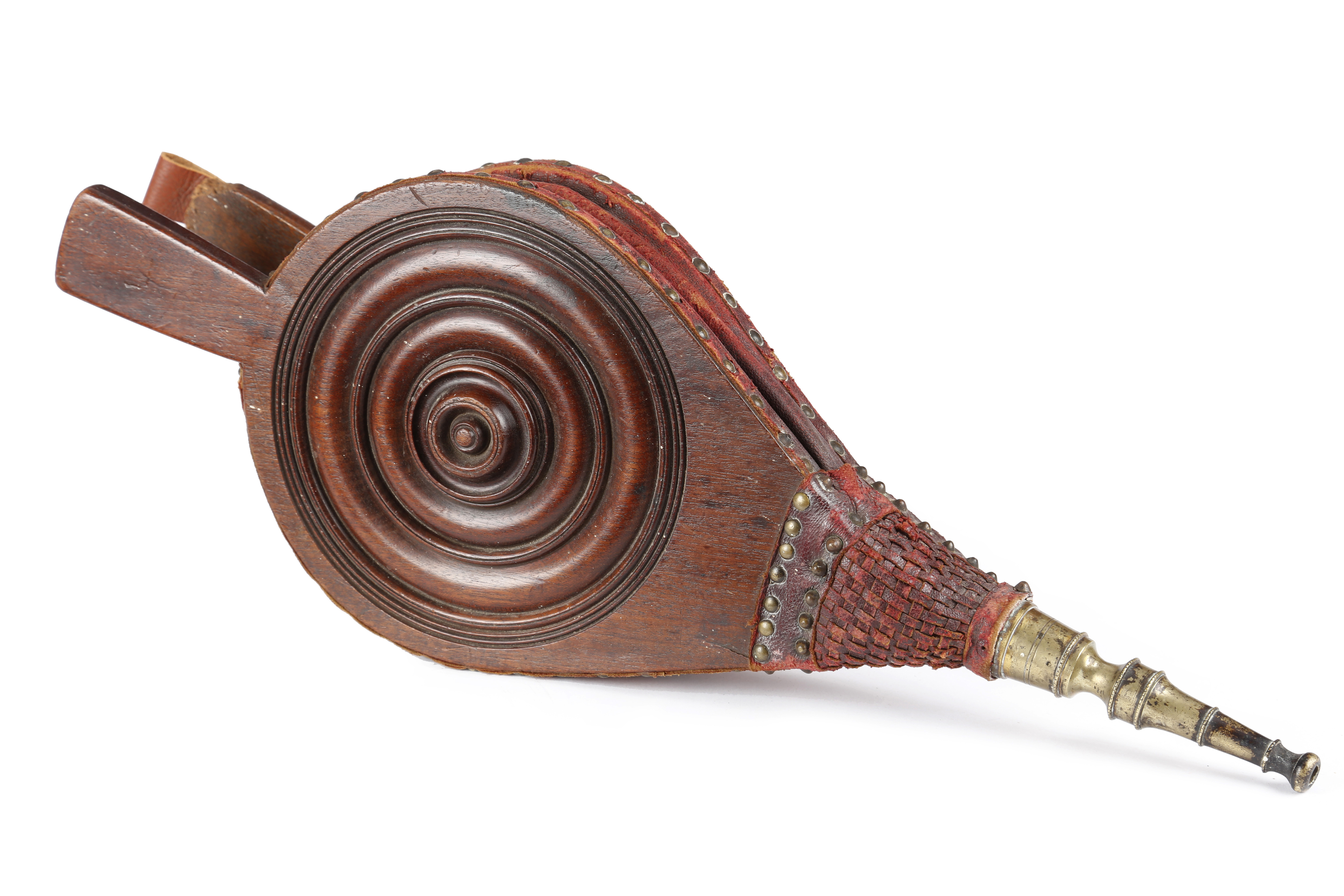 one side decorated with a turned rondel, with studded leather and a brass nozzle
