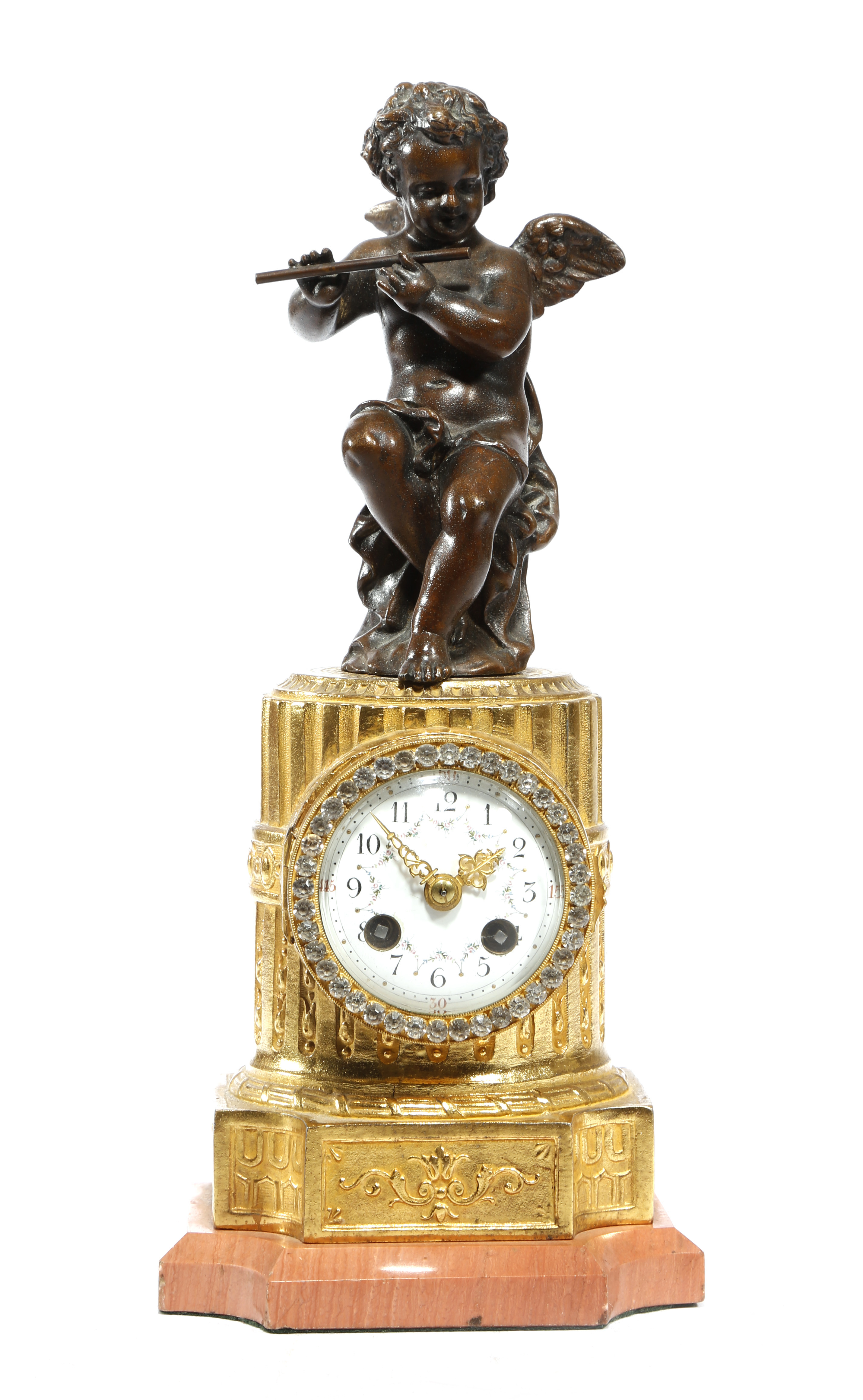 the brass drum eight day movement with a lever escapement and an outside countwheel striking on a bell, the backplate stamped '85958...', the white enamel dial decorated with swags of flowers, with Arabic numerals and pierced gilt hands, the bezel applied with paste faux diamonds, the fluted column case surmounted by a winged cherub playing a flute