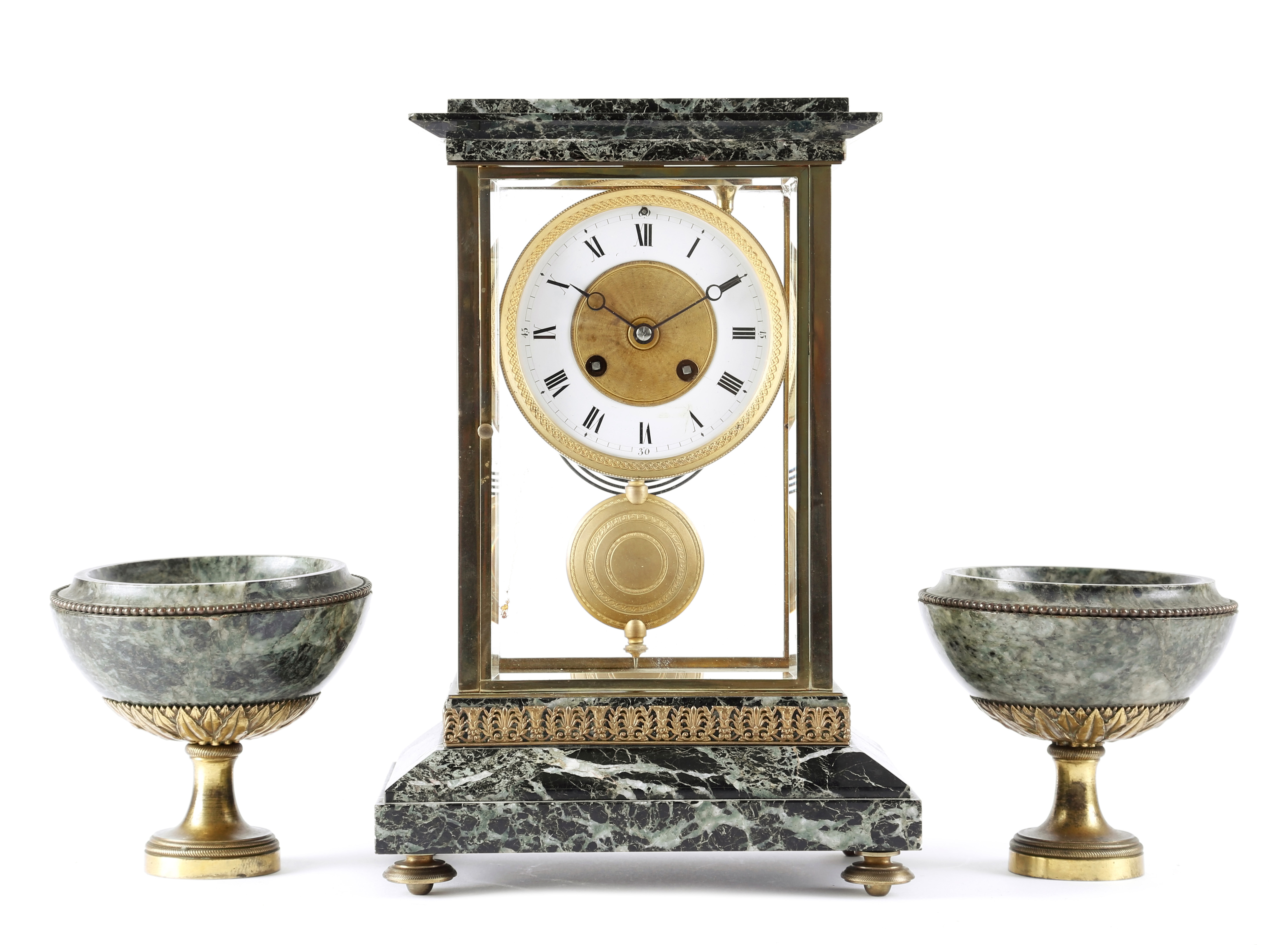 A FRENCH VERDE ANTICO MARBLE FOUR GLASS MANTEL CLOCK GARNITURE
