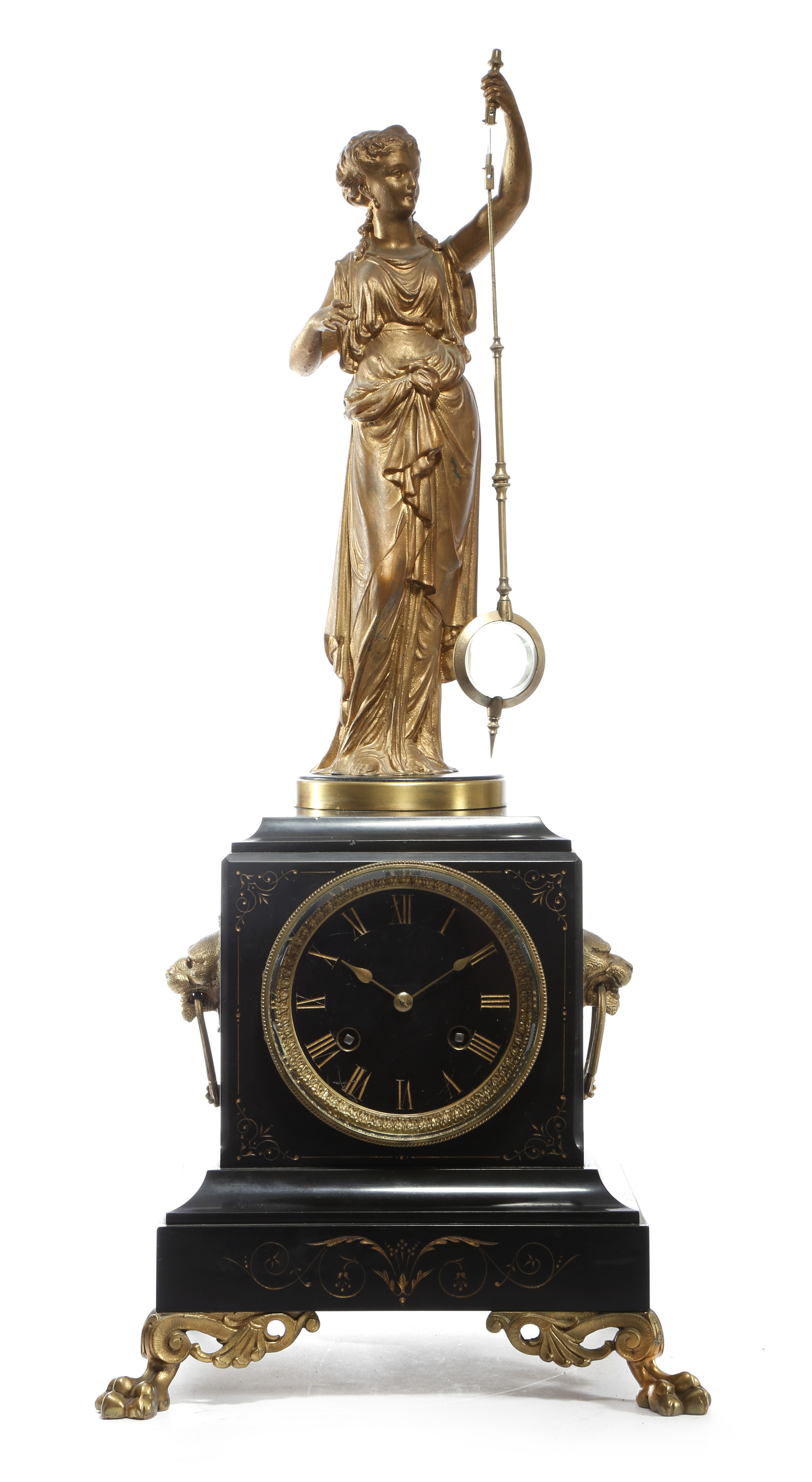 This fascinating clock, one of a series, was first designed and patented in 1867. The mystery lies in the fact there is no apparent impulse being received by the pendulum to keep it in motion. This is achieved by an imperceptible rotational movement of the platform on which the statue rests, with an impressive crank and stirrup escapement.