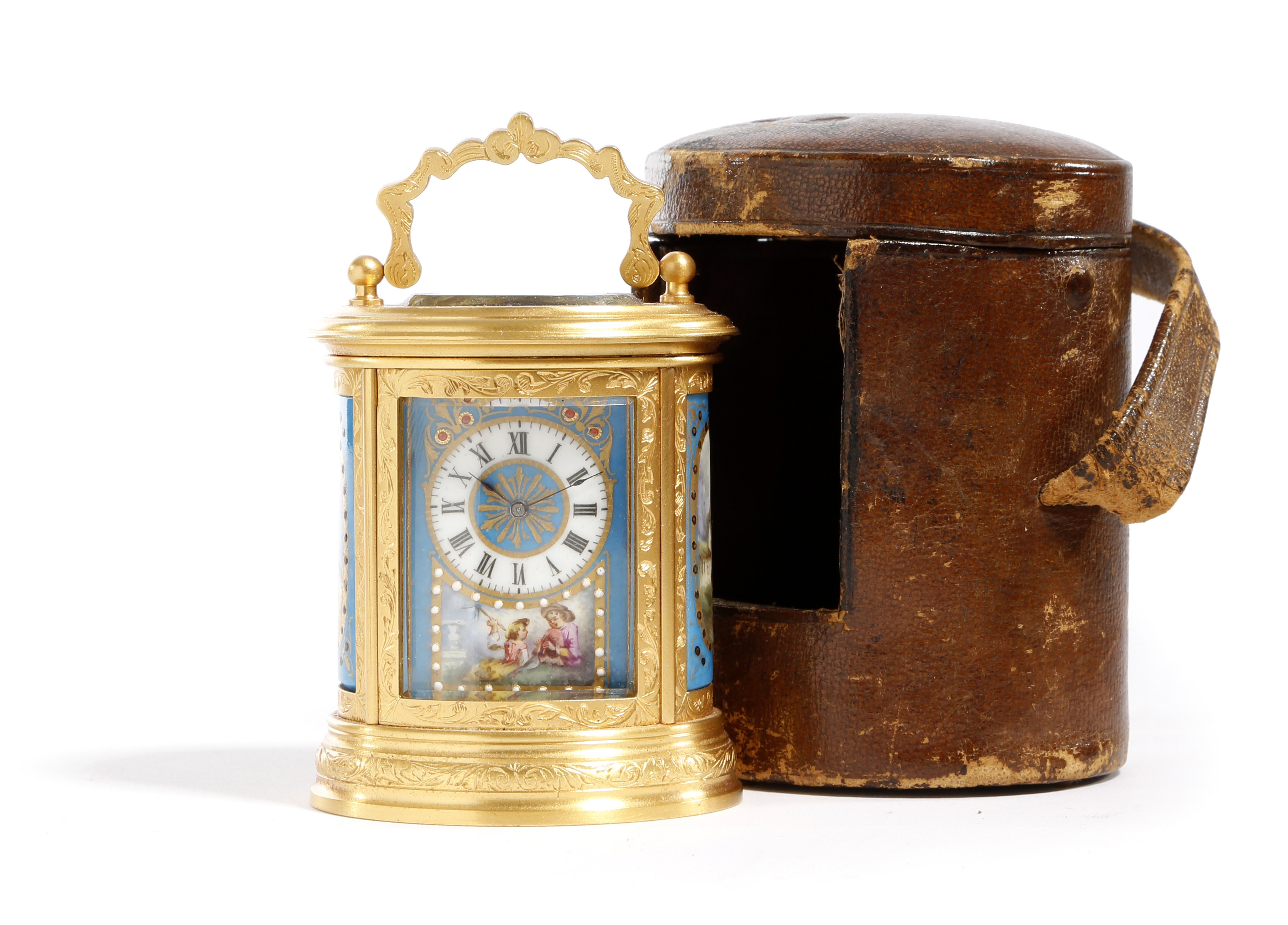 the brass movement with a platform lever escapement, the circular dial with Roman numerals and blued steel hands, the engraved gilt brass case with four jewelled porcelain panels painted with scenes of 18th century figures, cottages and woodland, the base numbered '1930', in a leather travelling case