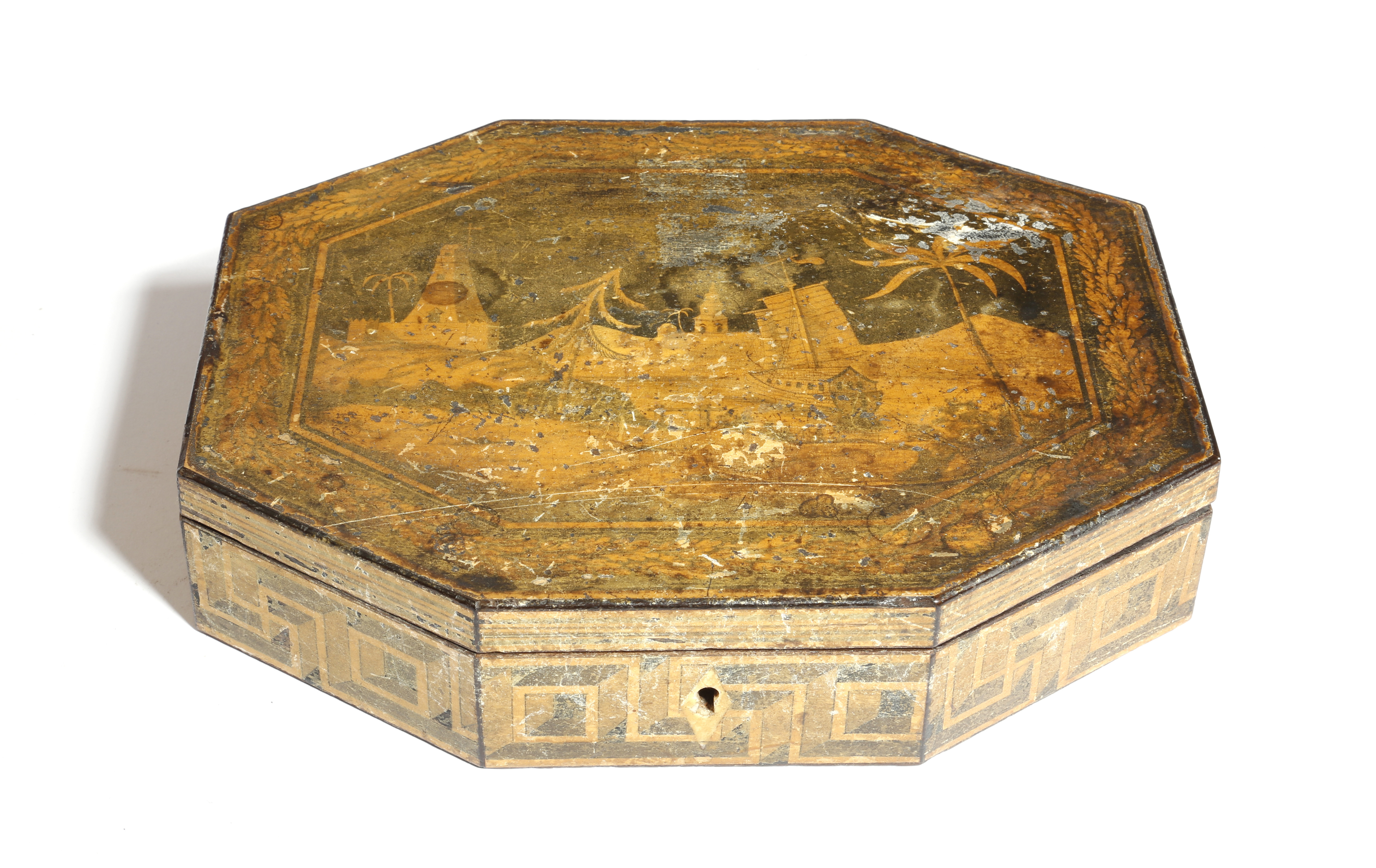 A REGENCY PENWORK OCTAGONAL BOX EARLY 19TH CENTURY the hinged lid decorated with a desert scene