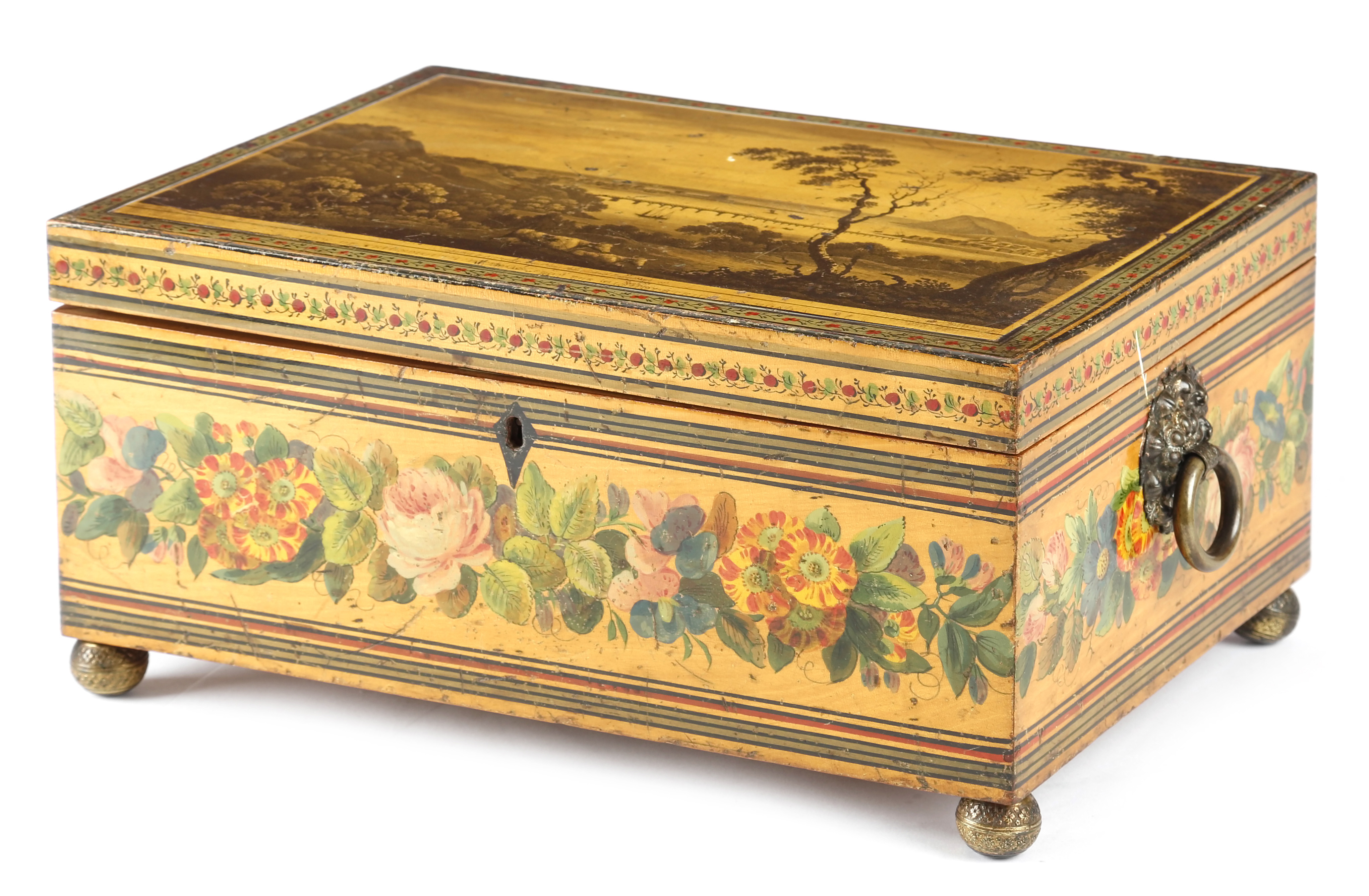 decorated overall with bands of flowers and leaves, the hinged lid with a printed scene 'View of Teignmouth Bridge from the Bishopsteignton Road' published by E. Croydon, 1827, the blue paper lined interior with a divided lift-out tray with some lidded compartments, with brass ring handles and on foliate decorated ball feet