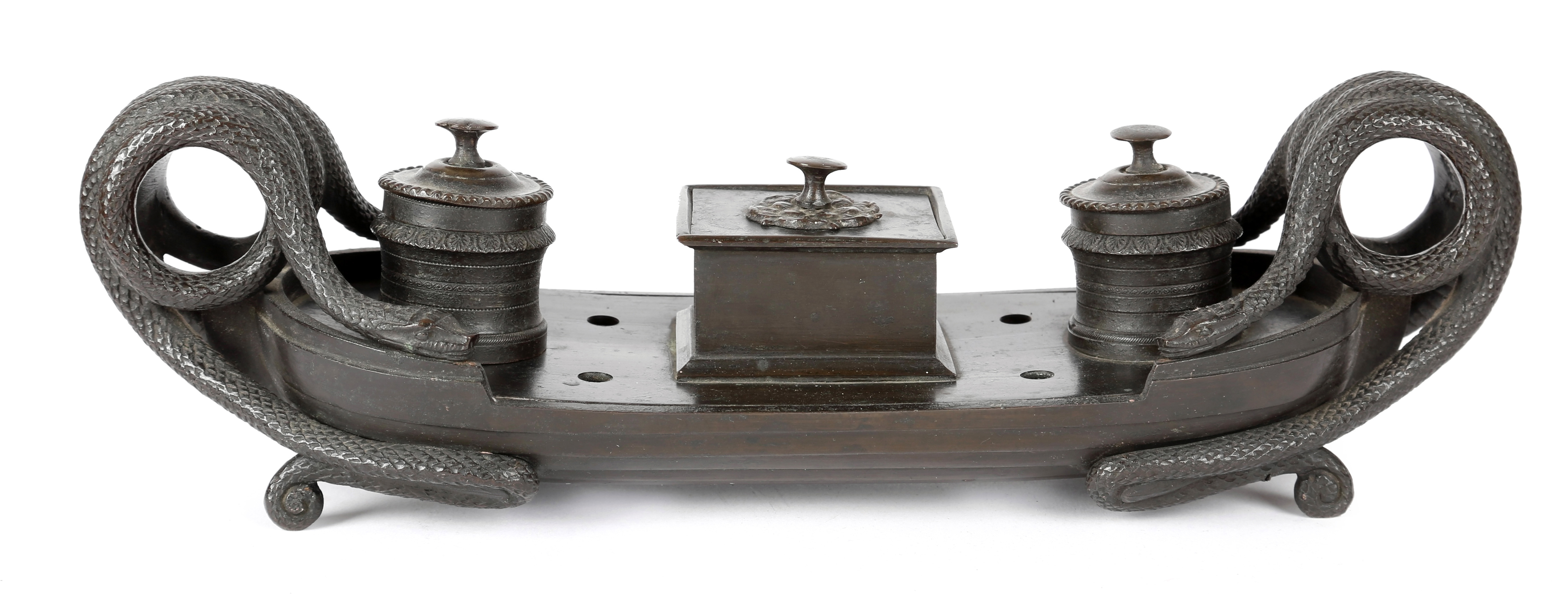 of bateau form, with a pair of twin serpent handles, the central lidded compartment flanked by four apertures for pens and a pair of lidded cylindrical inkwell compartments
