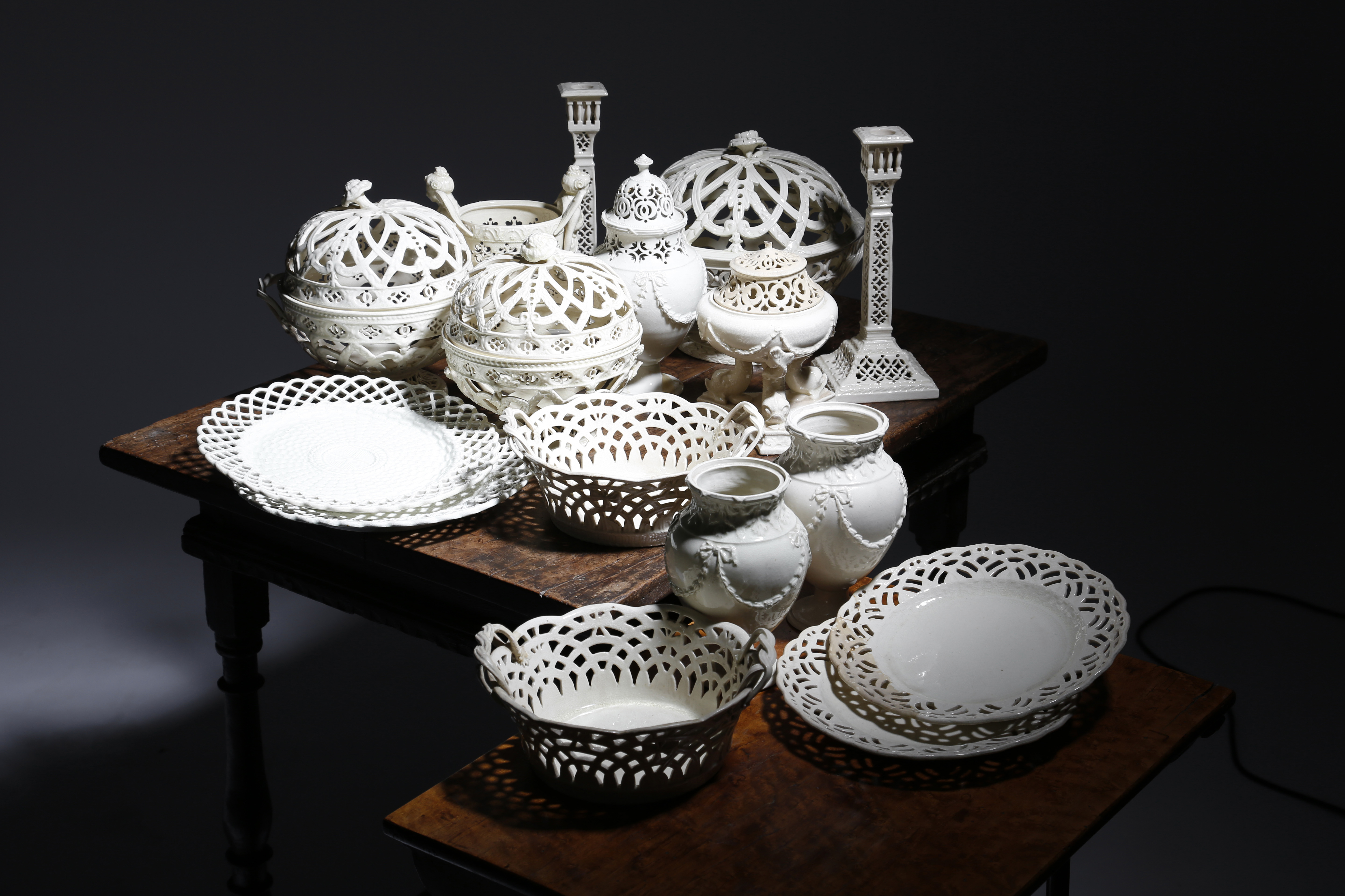 the majority by Leeds Pottery and with reticulated decoration, comprising: three chestnut baskets and covers with flower finials, a pair of open baskets with strap handles, a pair of square section candlesticks, three ovoid vases, decorated with ribbon tied swags, one with a cover, a vase and cover with dolphin supports, an ovoid vase with winged female caryatids and four plates with impressed marks 'Leeds Pottery', some with paper labels for Thomas Goode 'T. G. & Co. London' (21)