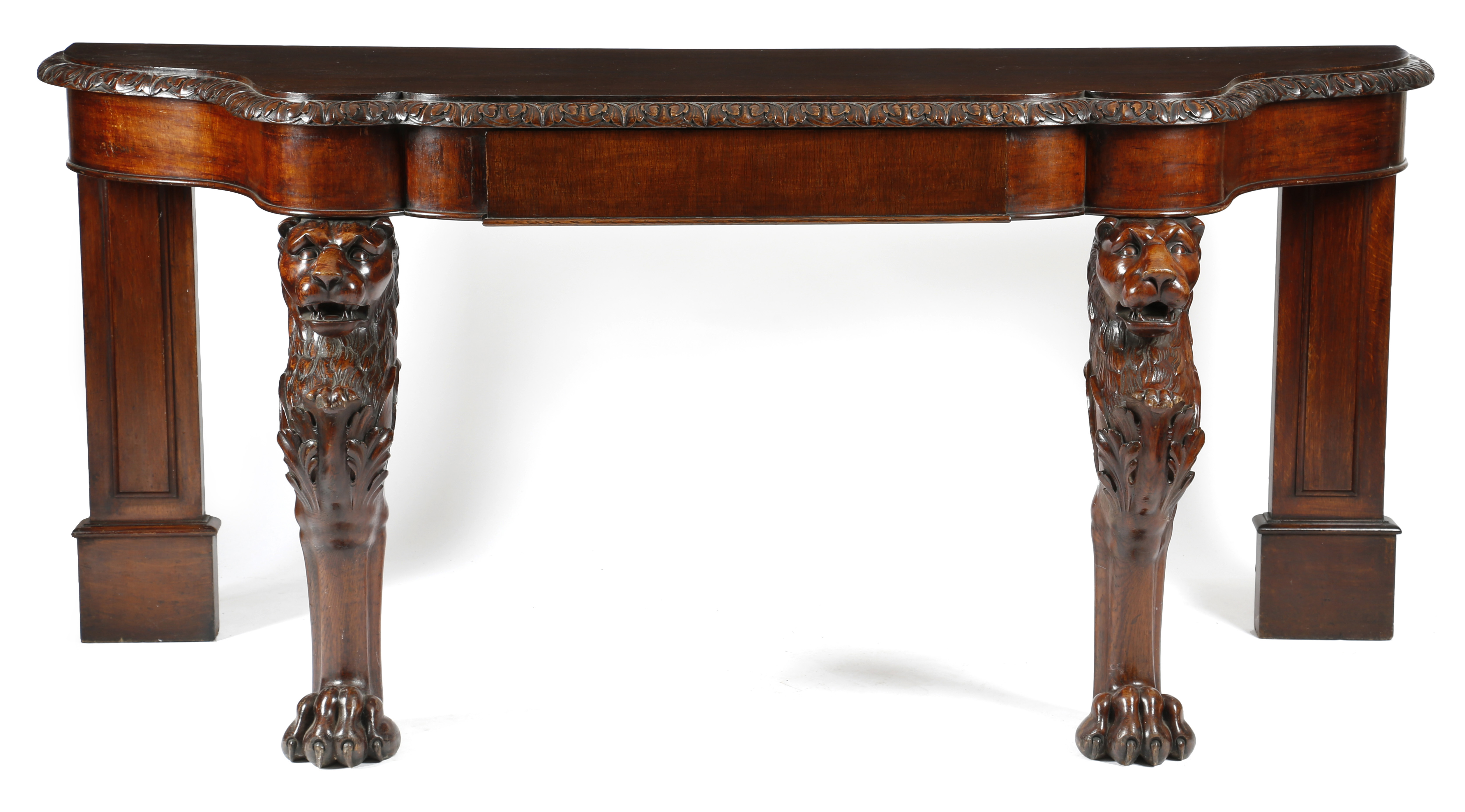 the shaped top with a leaf carved moulded edge above a frieze drawer, on boldly carved lion's monopodia front legs, the back stamped 'Strahan'