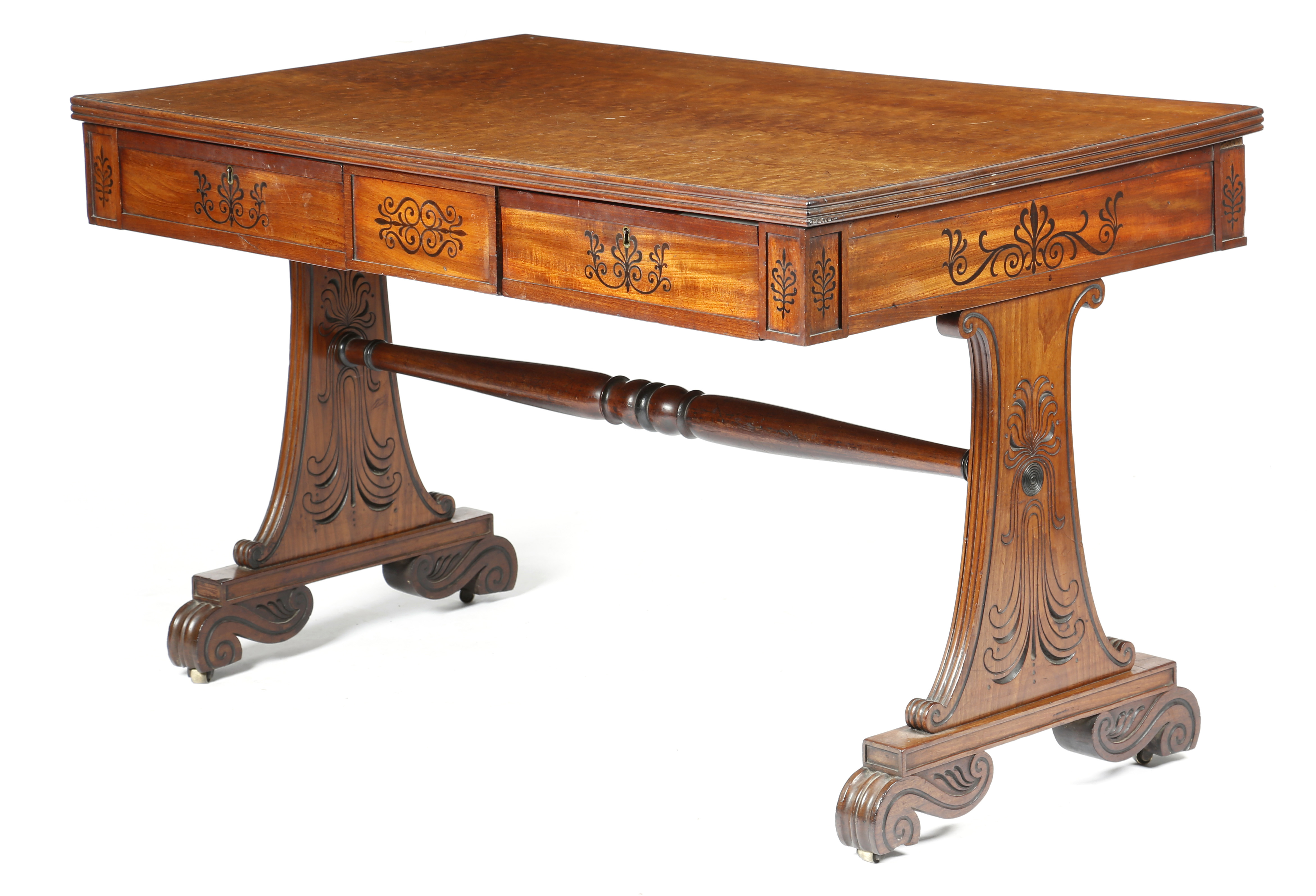 inlaid with ebonised palmettes, the top with a reeded edge above a pair of cedar lined frieze drawers, the reverse with false fronts, on scroll trestle ends with incised anthemion motifs, united by a turned stretcher, on conforming scroll feet and brass castors
