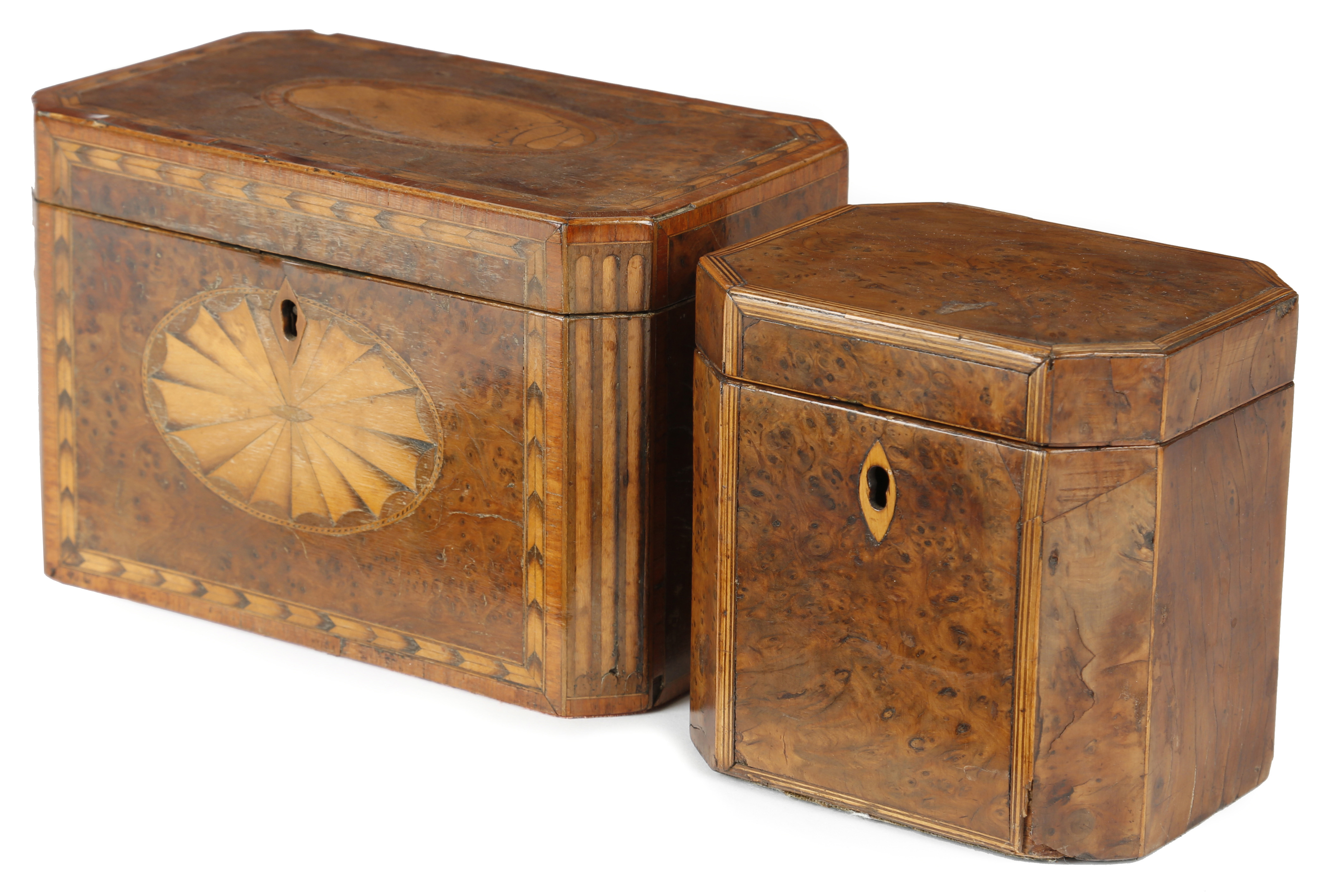 of canted form and inlaid with stringing, with a vacant interior, together with a similar box, originally a tea caddy but now with a later lined interior (2)