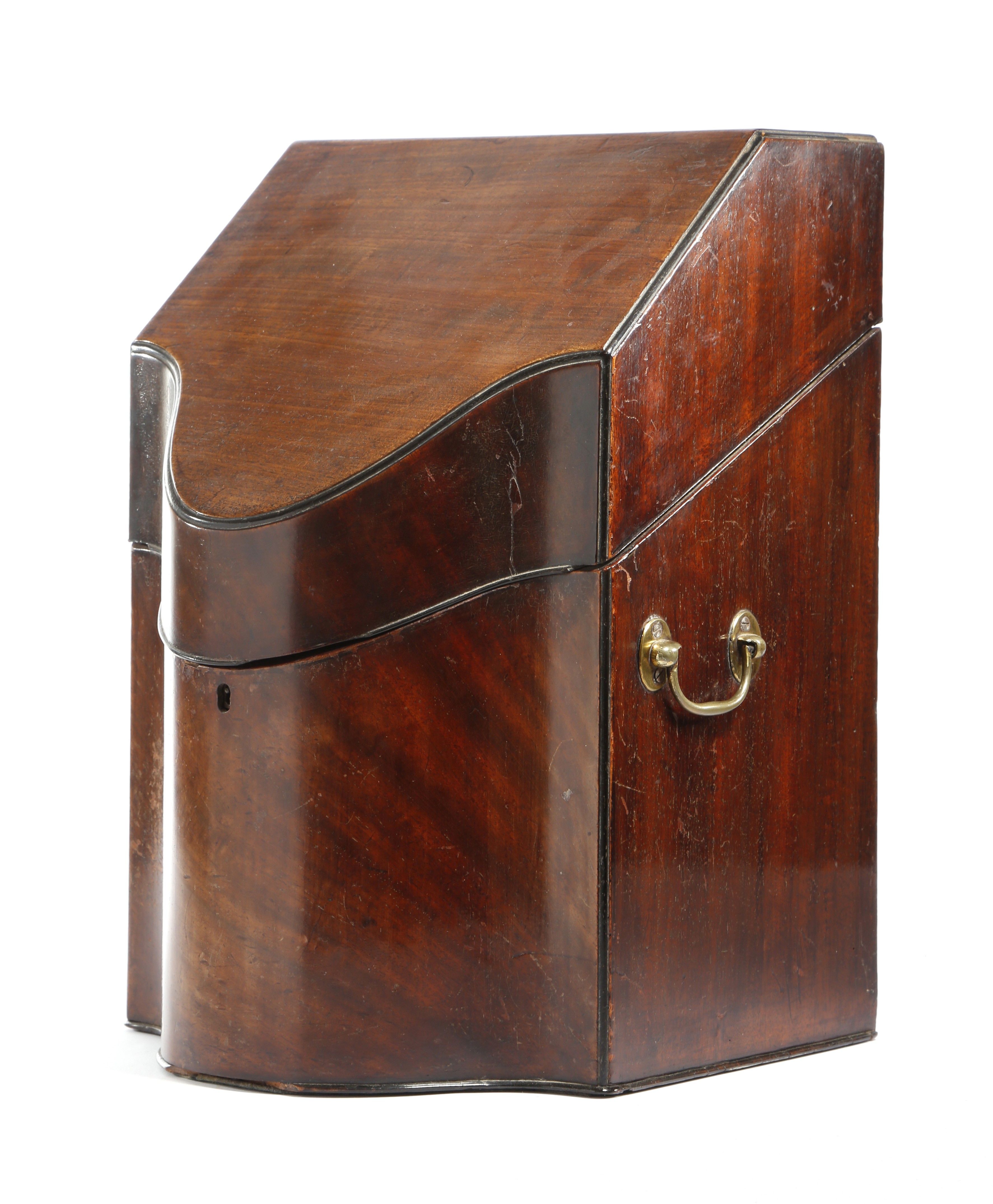A GEORGE III MAHOGANY KNIFE BOX C.1805 AND LATER with a serpentine front and ebonised edging