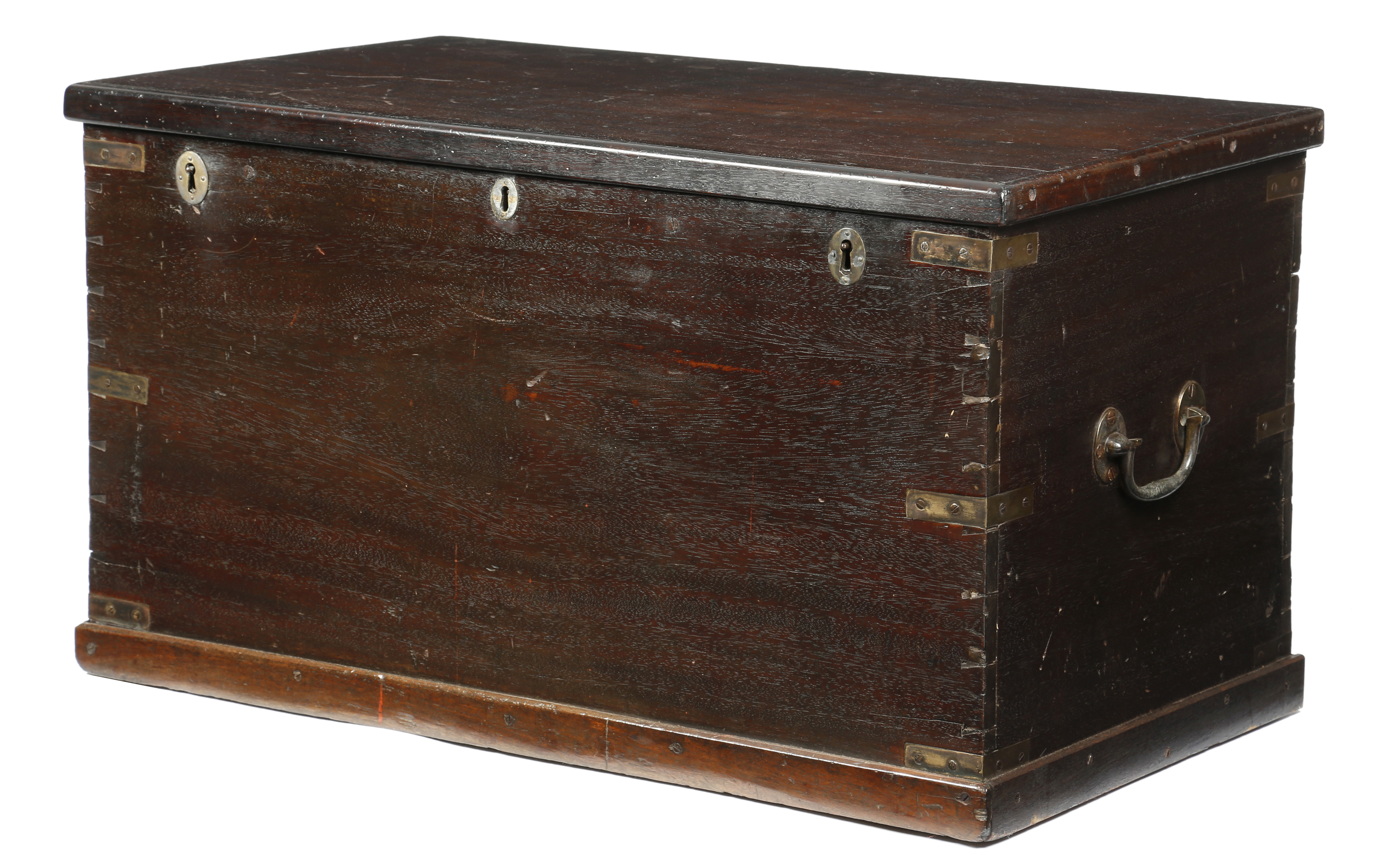 A NAVAL TEAK SEAMAN'S CHEST LATE 18TH / EARLY 19TH CENTURY the hinged top with a paper label to...