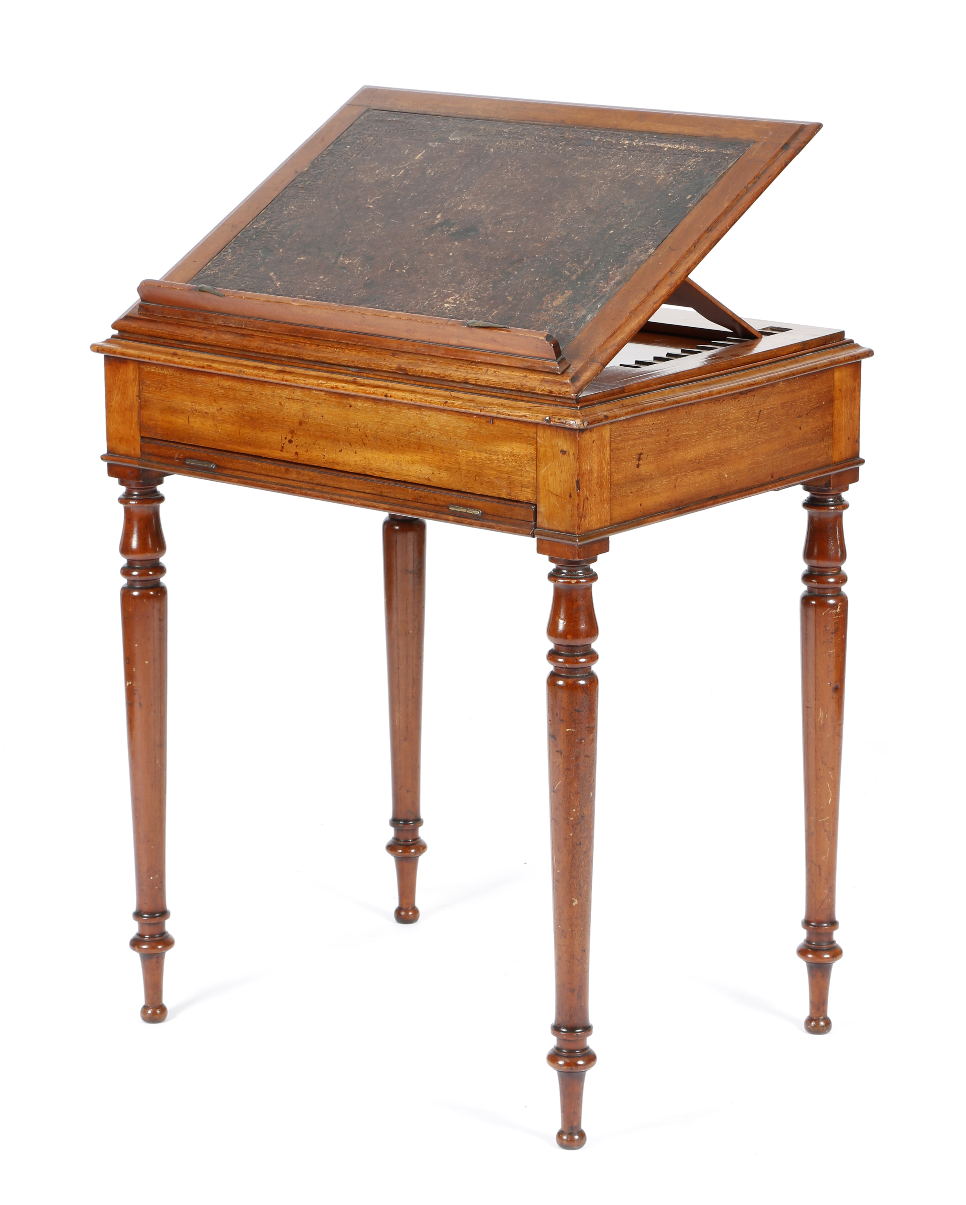 the drop-in top inset with a gilt tooled leather writing surface on a hinged ratchet and with a rest, above a raised beading, the frieze with a slide-out hinged rest, with forty-five pierced and brass mounted holes, on turned tapering legs